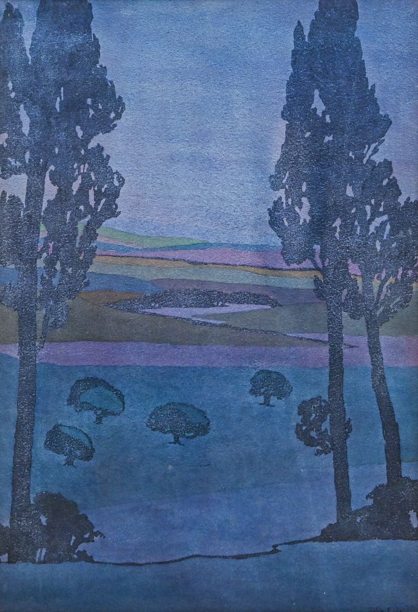 John Eddy Large Format Color Woodcut c1910s. Signed. Excellent condition. From the personal collection of Steven Thomas, Woodstock, VT. 20.5"h x 14.25"w. Frame 29.25"h x 23"w