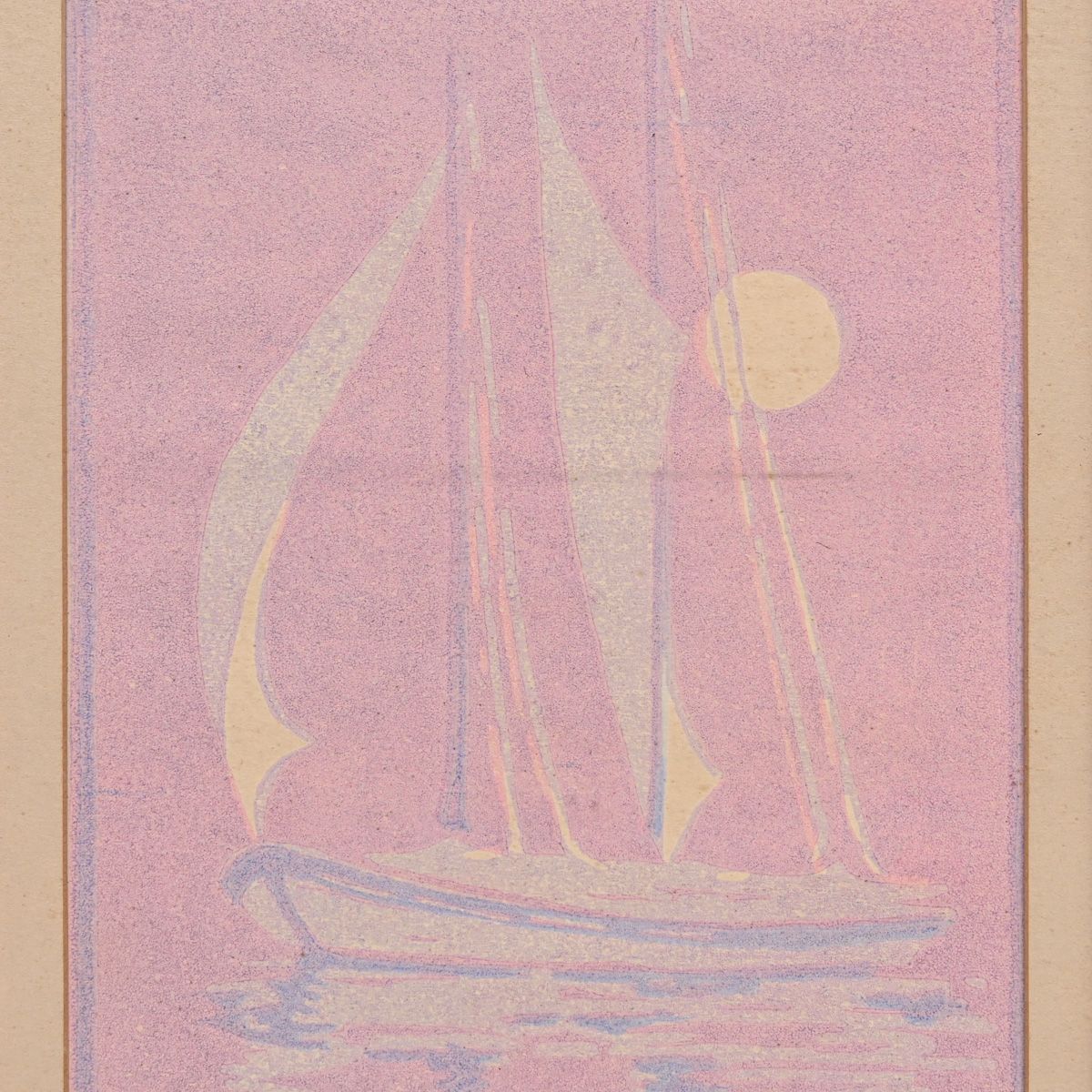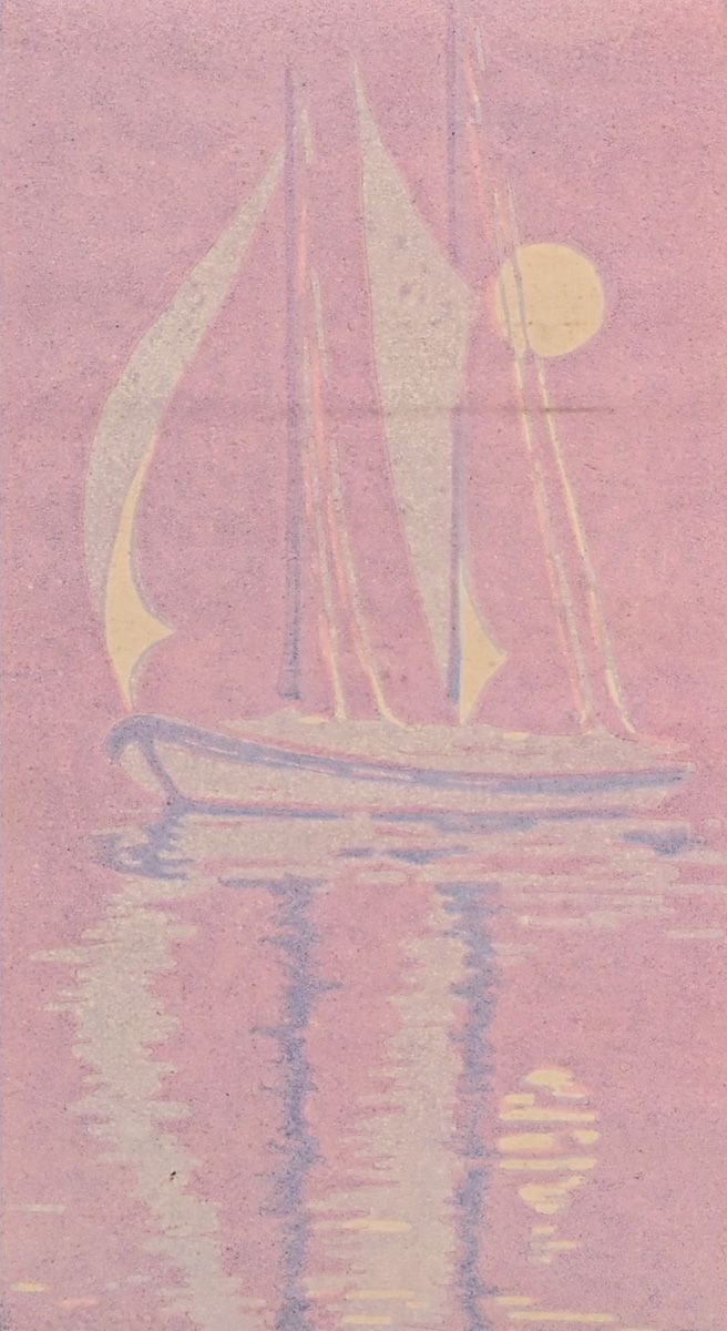 - Sadie Irvine (1887-1970) Color Woodcut "Sailboat with Full Moon-Pink" c1915