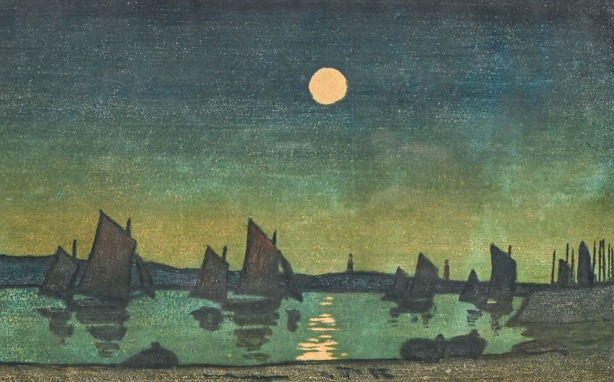 - Thomas Austen Brown (Scottish 1857-1924) Color Woodcut "Sailboats in Moonlight" c1900s