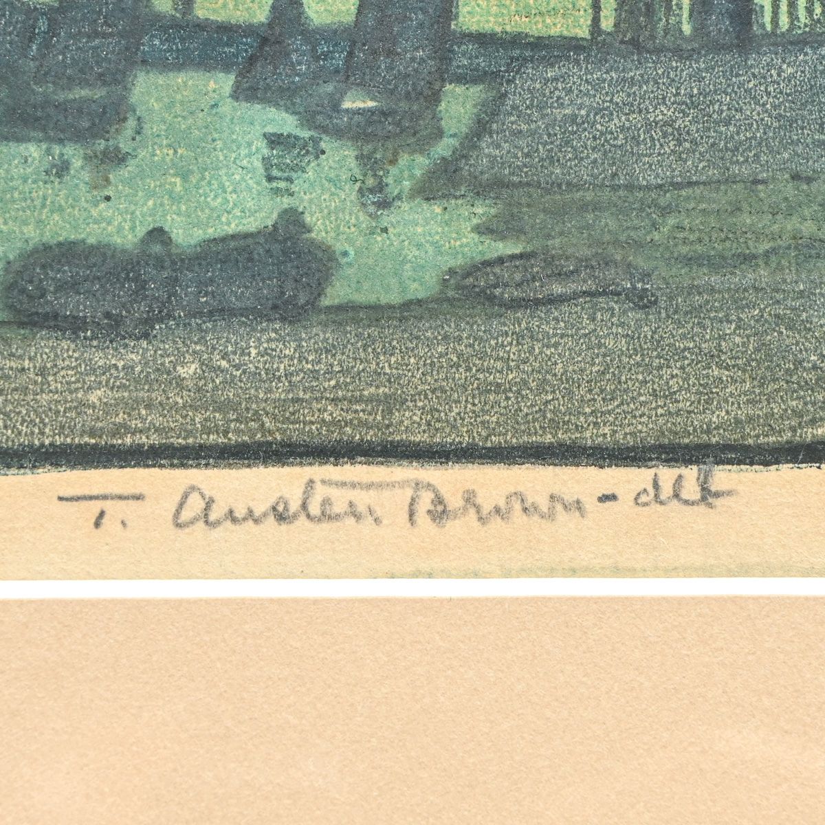 Thomas Austen Brown (Scottish 1857-1924) Color Woodcut "Sailboats in Moonlight" c1900s. Brown was a student of Frank Morley Fletcher, who taught this specific method at the Reading School of Art in England only between 1898 and 1906. Signed. Excellent condition. 5.25"h x 7.75"w. Frame 11.25"h x 13"w