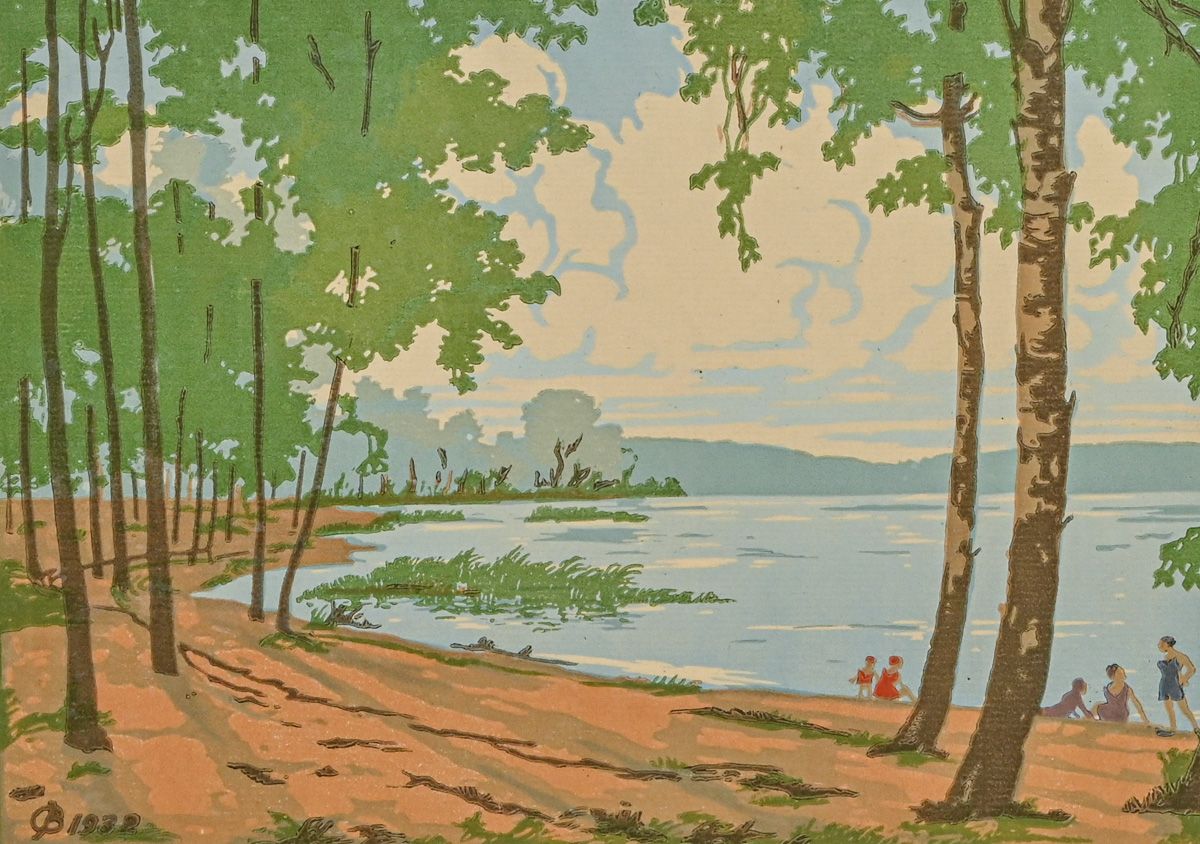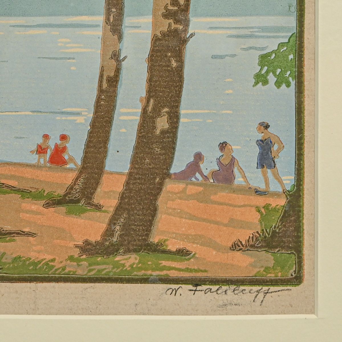 - Vadim Dmitrievich Falileev (Russian 1879-1950) Color Woodcut "Bathers at a Lake" 1932