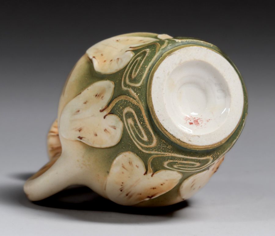 Amphora Pottery Lily Pad Decorated Pitcher c1900. Signed. Invisible professional restoration to rim points, otherwise perfect condition. 5.75"h x 4.25"w x 3.5"d SOLD