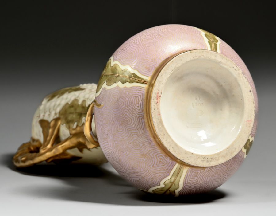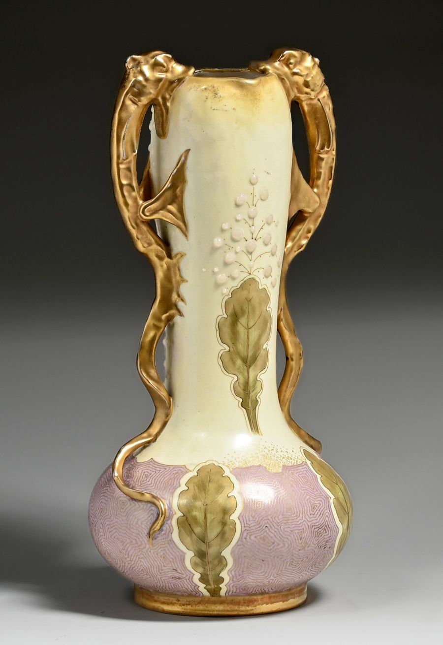 Tall Amphora Pottery Two-Handled Jeweled Vase c1900. Signed. Invisible professional restoration to lower handle, otherwise perfect condition. 15.25"h x 7"w $1200