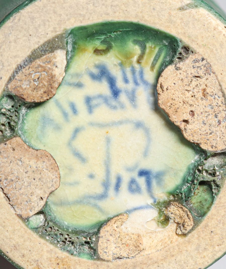 Arequipa Pottery Matte Green Vase c1911-1912. Signed with earliest mark. Invisible professional restoration to small base chip, otherwise perfect condition. 5.25"h x 2.5"d SOLD