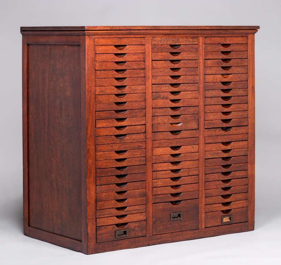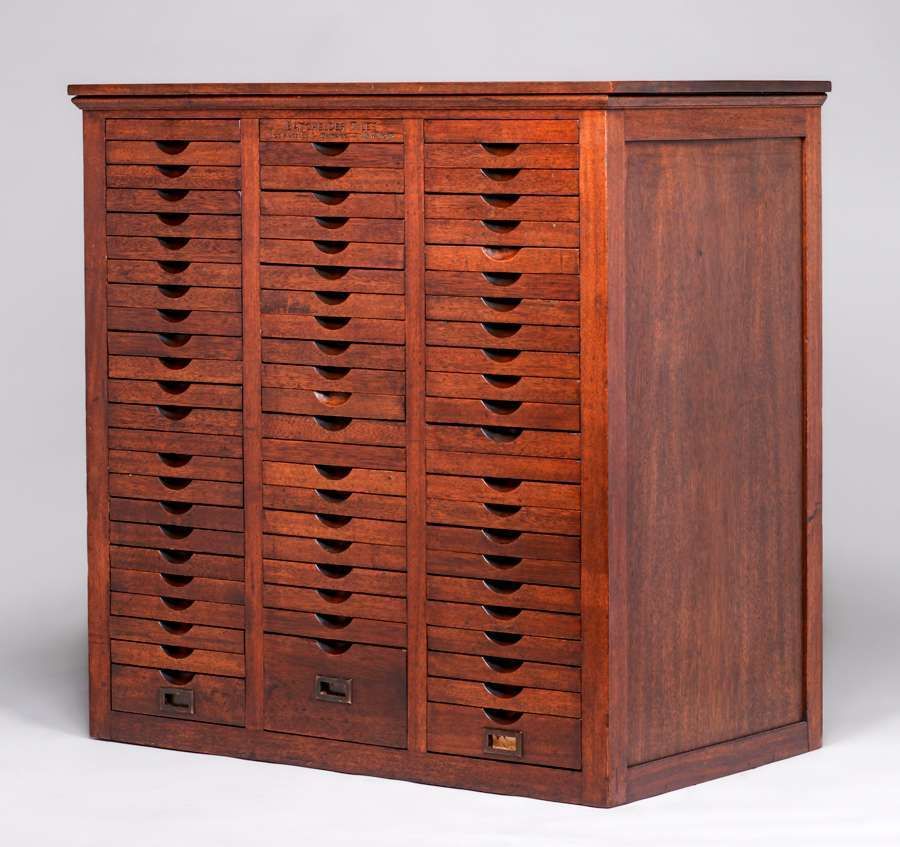 Rare Batchelder Seventy-Drawer Tile Cabinet c1920. Designed for the retailer of Batchelder Tiles. Carved in top center drawer "BATCHELDER TILES LOS ANGELES CHICAGO NEW YORK". Excellent original finish. 49.25"h x 49"w x 28.25"d SOLD