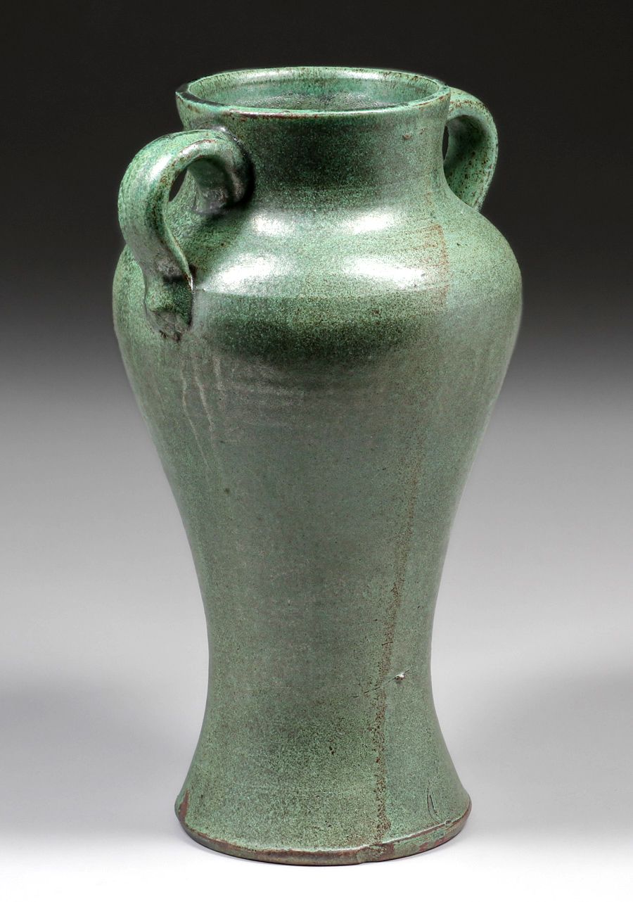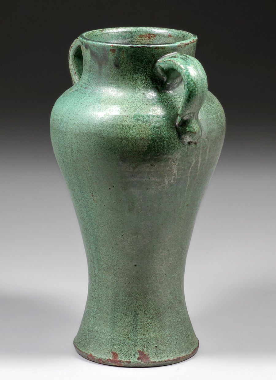 Early Bauer "Rebekah" Matte Green Two-Handled Matt Carlton Vase c1915. Unsigned (all of the hand thrown Matt Carlton vases were unsigned). Invisible professional restoration to a couple of small base chips, otherwise perfect condition. 14.5"h x 9"w SOLD