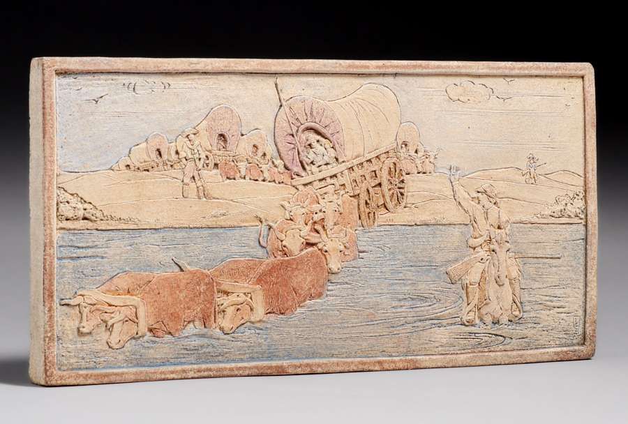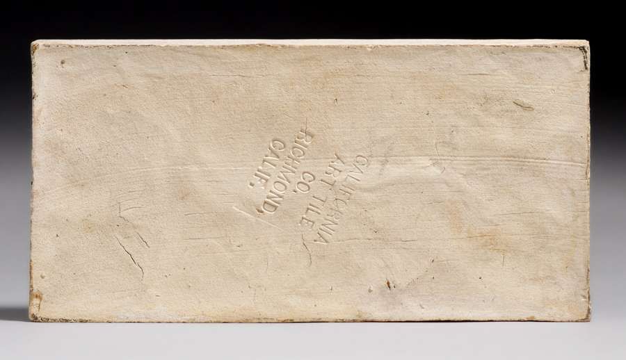 Cal Art - Richmond Scenic Wagon Tile c1920s. Signed. Invisible professional restoration to corners, otherwise perfect condition. 15.5"w x 7.75"h $2200
