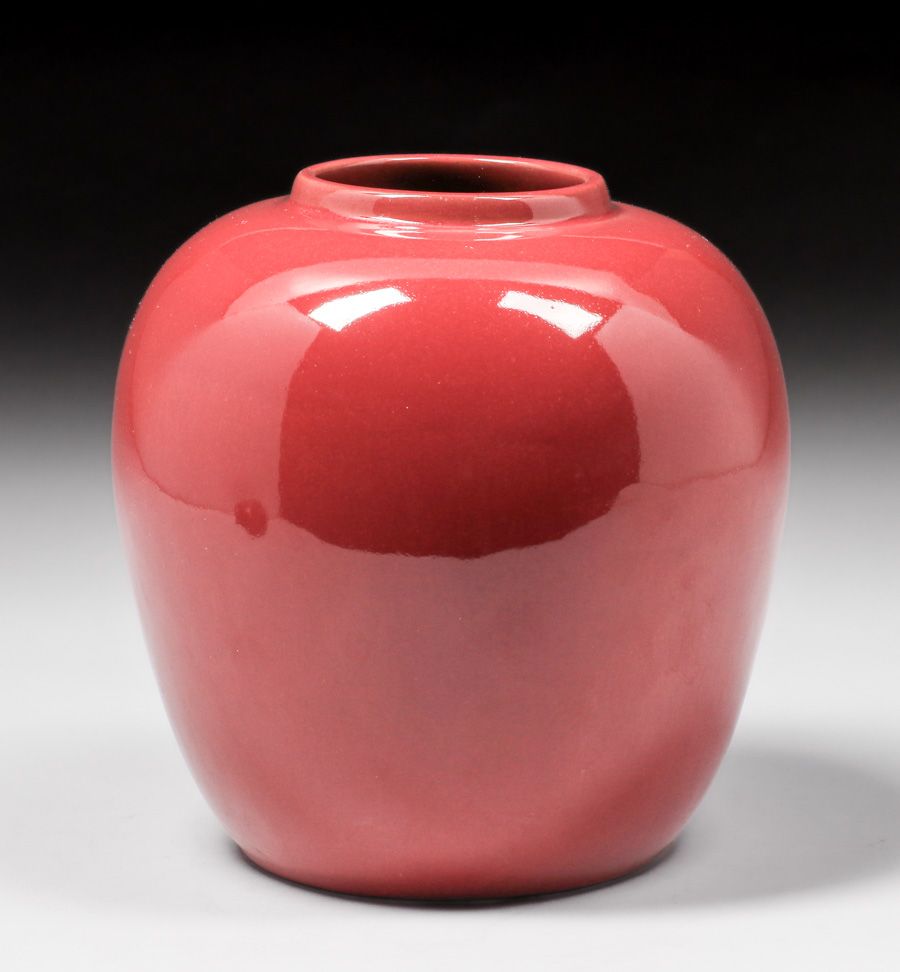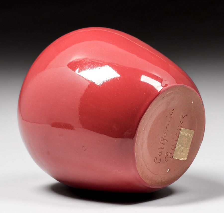 California Faience Burgundy Covered Ginger Jar c1920s. Retailed by Morcom's House of Beautiful Things Oakland. Signed. Perfect condition. 9"h x 6.5"d SOLD
