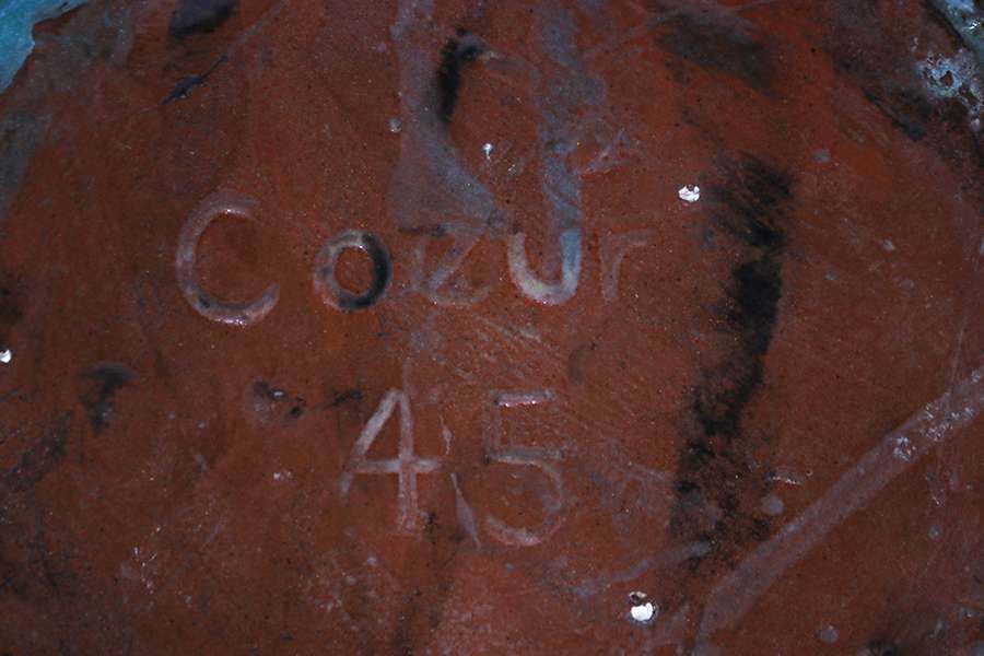 California Faience carved squat vase made by unknown artist signed "Coeur” and dated “45”. Possibly Berkeley High School. Kirby Brown Collection 8″d x 4 3/8" SOLD
