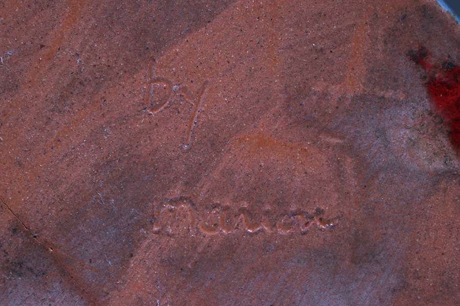 California Faience circular floral tile made by unknown artist signed only "by Marion” c1930s. Possibly Berkeley High School. Cracked. Kirby Brown Collection. 5″d SOLD