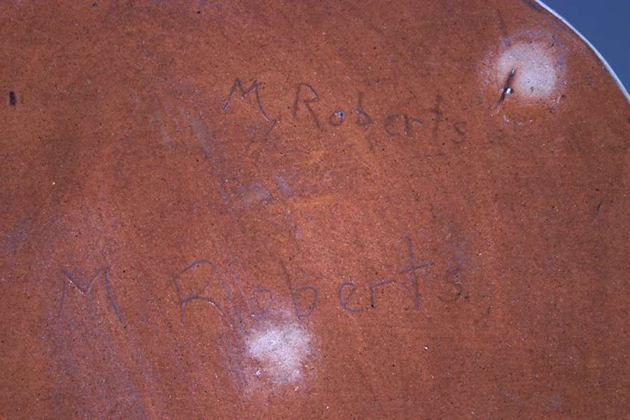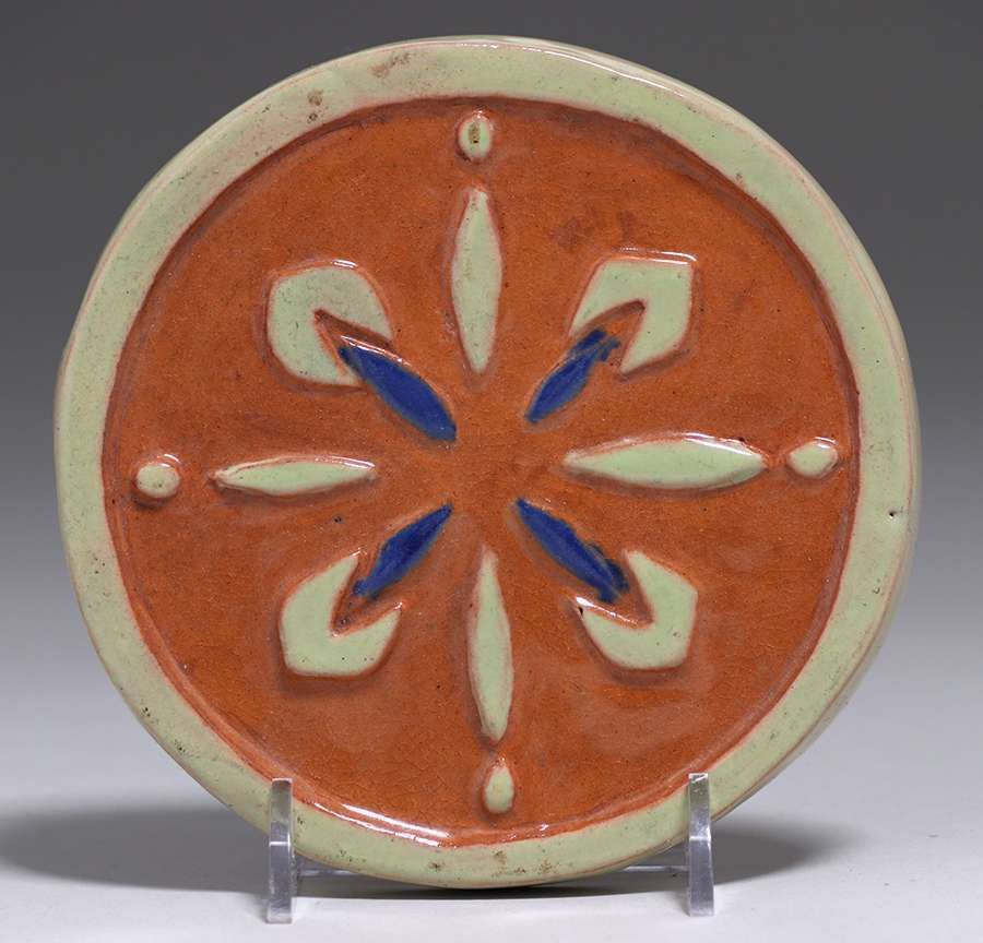 California Faience circular tile made by unknown artist signed only "by M. Roberts” c1930s. Possibly Berkeley High School. Perfect condition. Kirby Brown Collection. 5.25″d SOLD