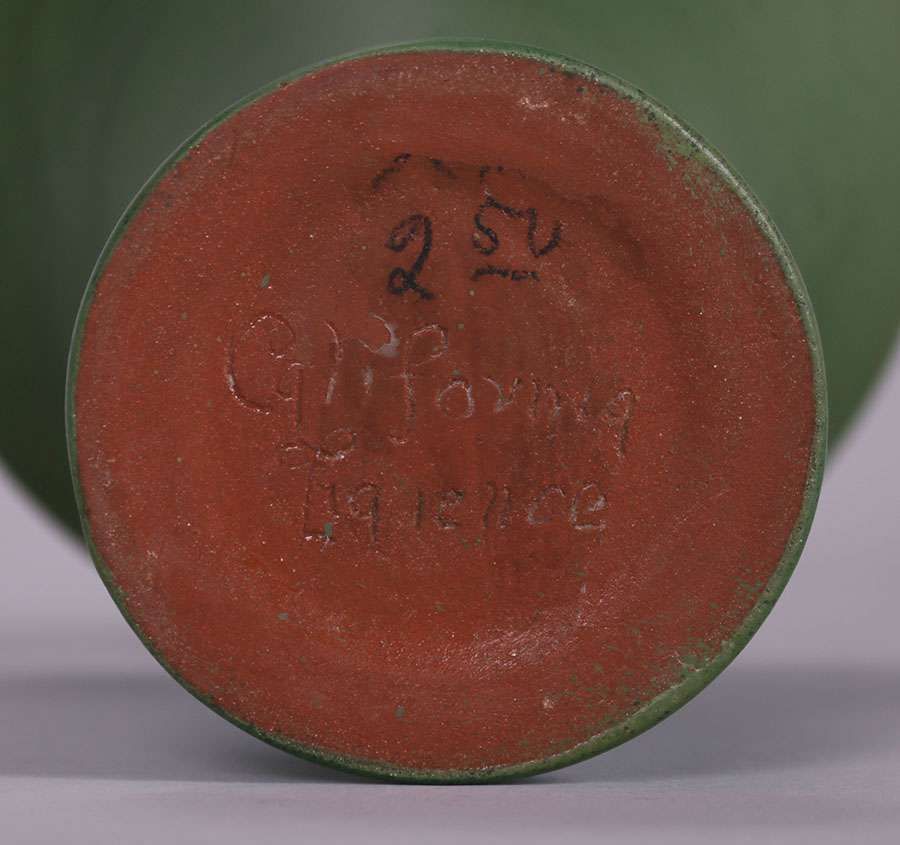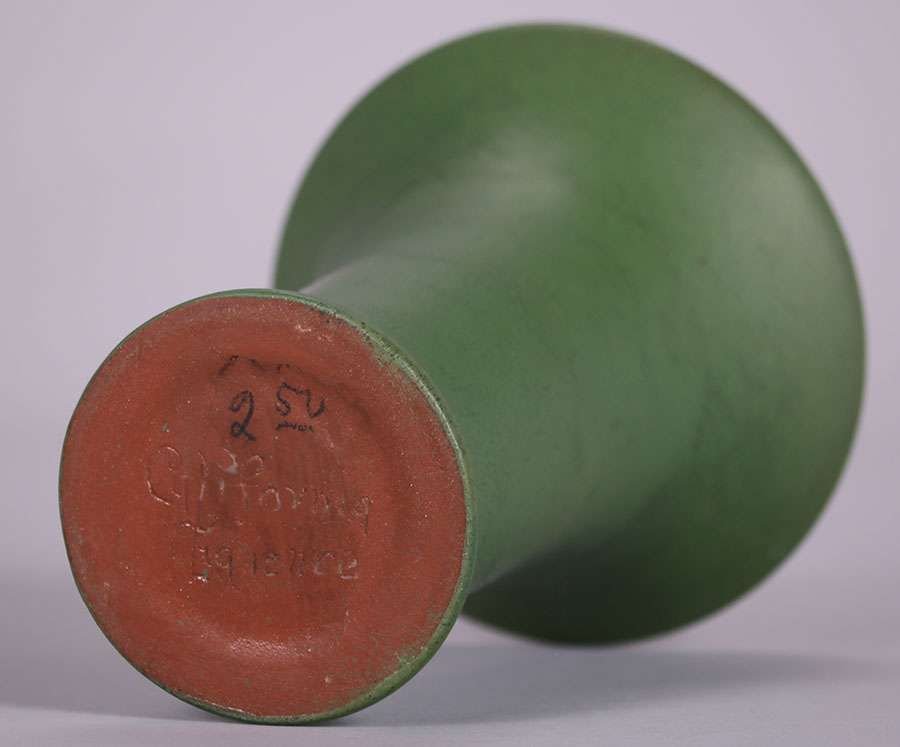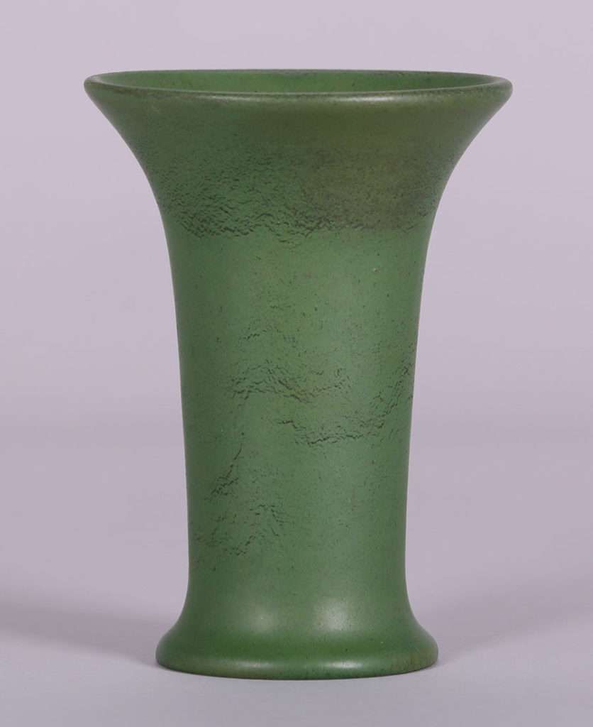 California Faience flared vase with a fantastic curdled matte green glaze. Invisible professional restoration to tight hairline, otherwise perfect condition. From the Collection of Kirby Brown. 7″h x 5″d SOLD