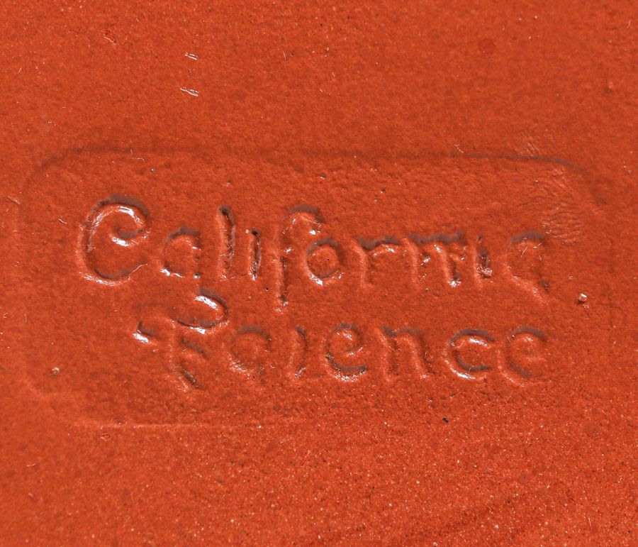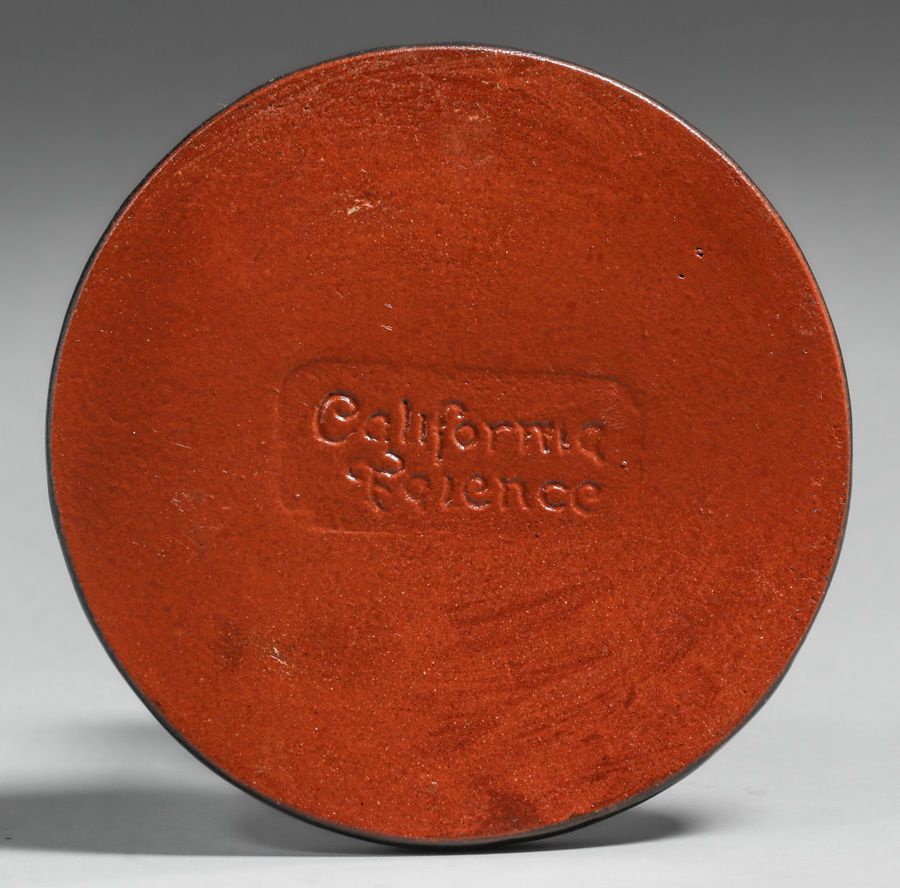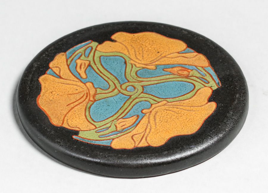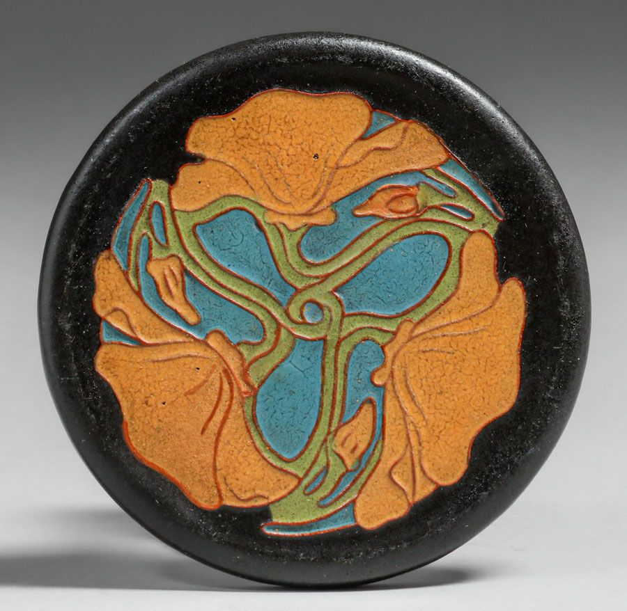 California Faience Matte Black Three Poppy Tile c1915-1920. Signed. Broken in half and professionally restored. 5.5″d SOLD
