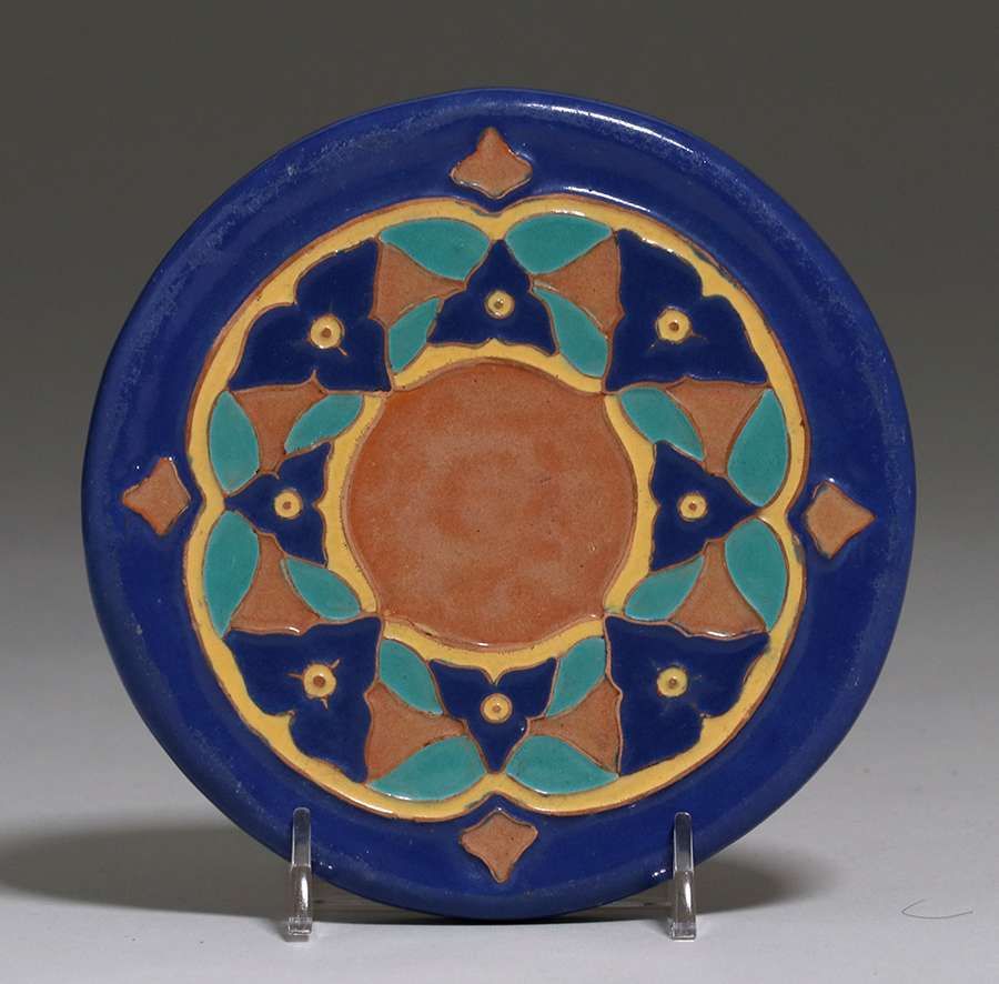 California Faience stylized floral tile c1930s. Signed “California Faience” and “AP” within a cipher. Surface edge wear, otherwise perfect condition. 5.75″d SOLD