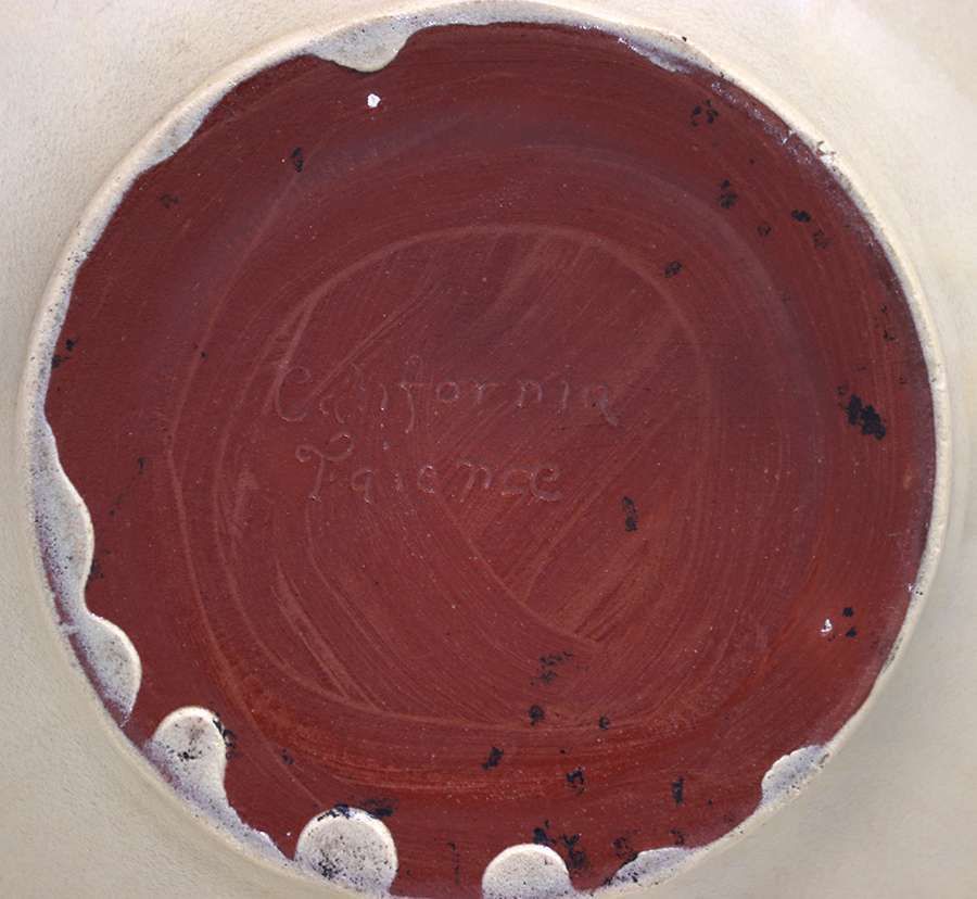 California Faience yellow fruit bowl with turquoise interior c1920s. Signed. Some pale lime deposits, otherwise perfect condition. 10″d x 3″h SOLD