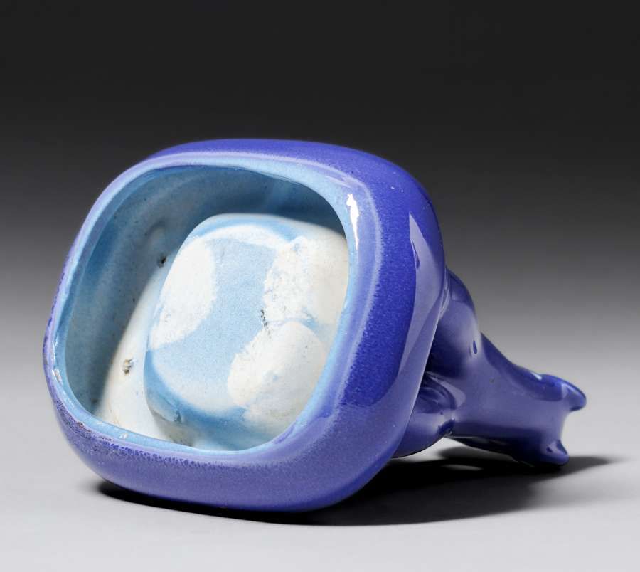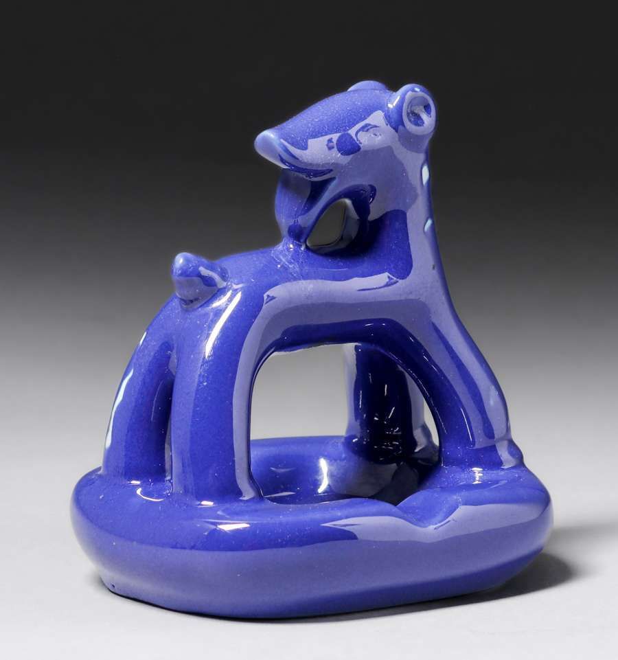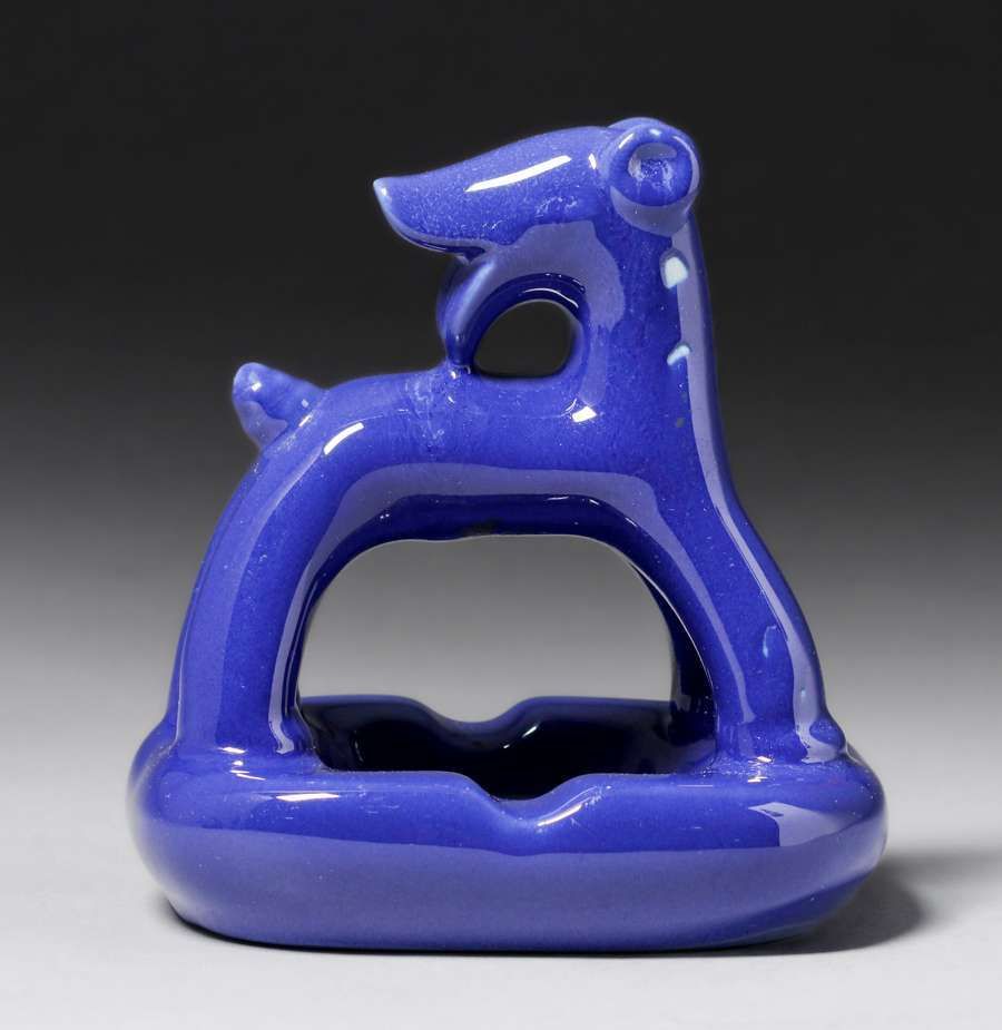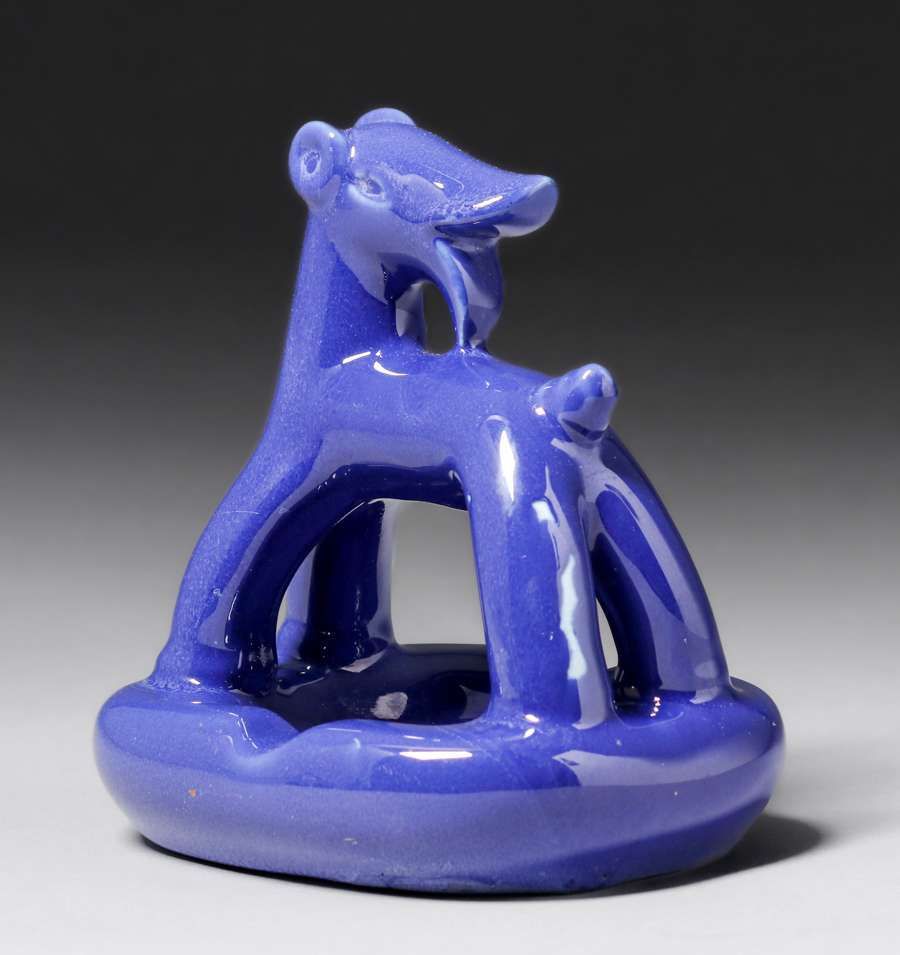 California Porcelain Art Deco Blue Glazed Figural Dog c1927-1929. Unsigned. A couple of glaze skips, otherwise perfect condition. 5.75″h x 5″ x 4″ SOLD