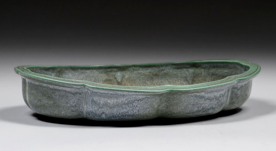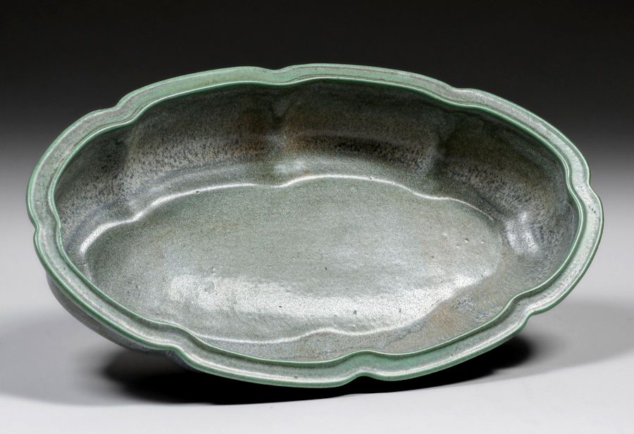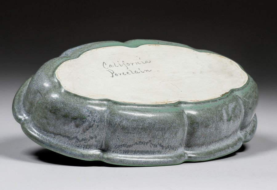 California Porcelain Micro-Crystalline Green Fruit Bowl c1927. Signed. Perfect condition. 13.25 x 8.5 x 2.75h inches SOLD