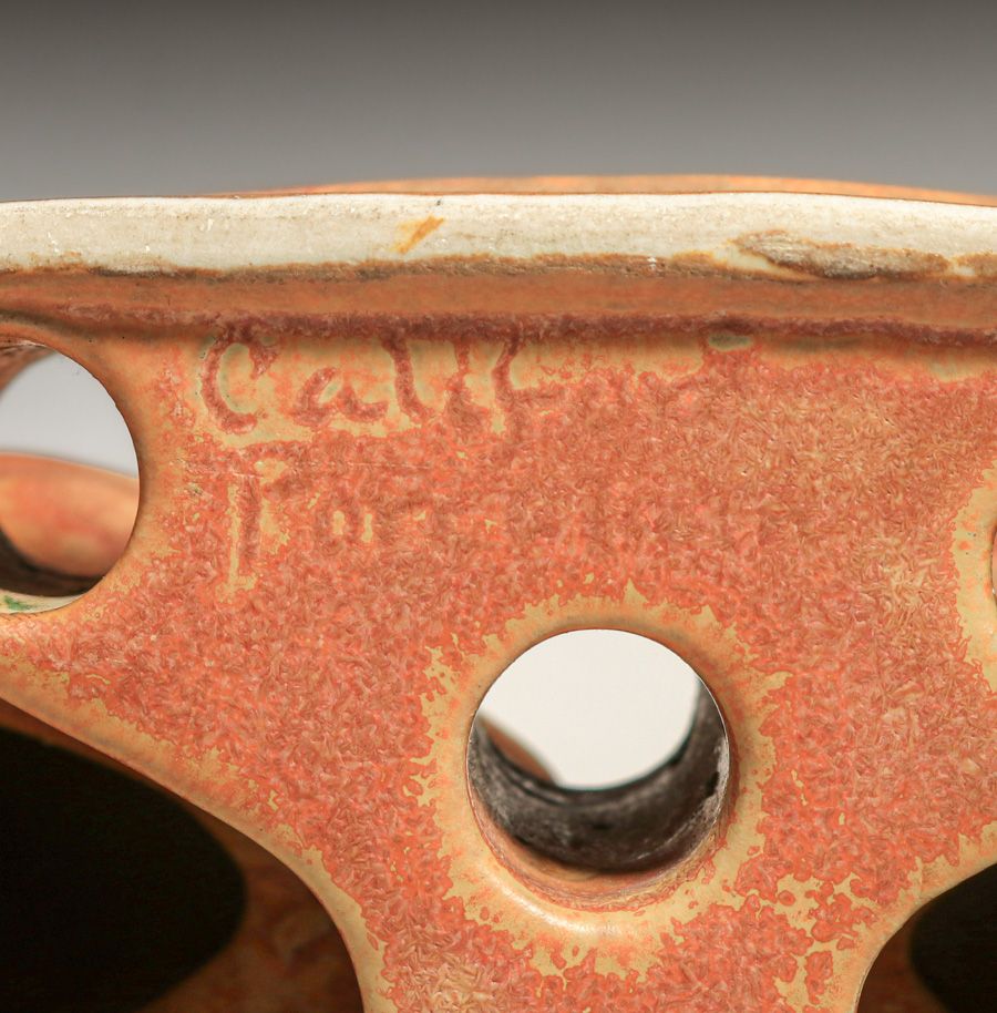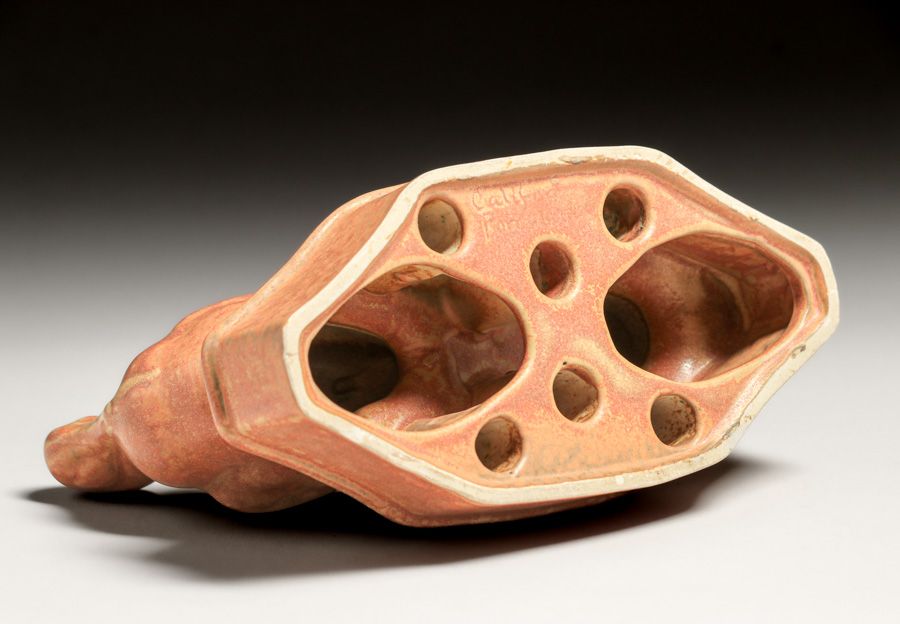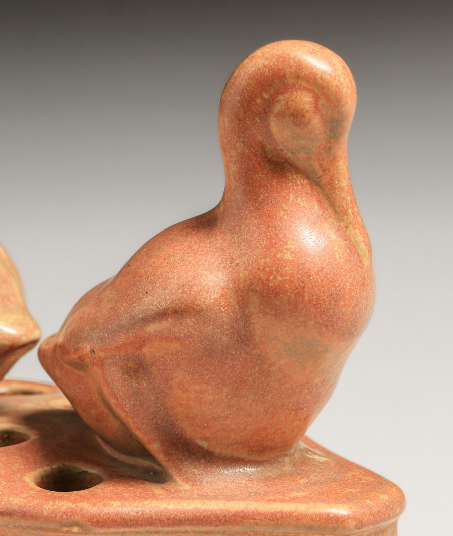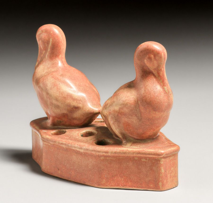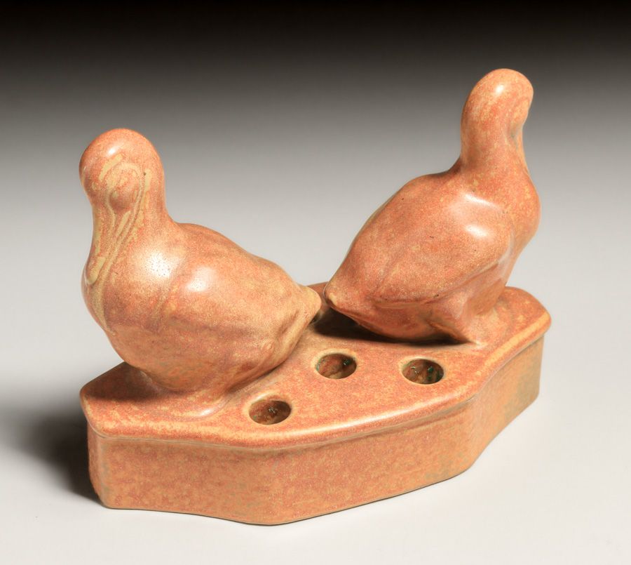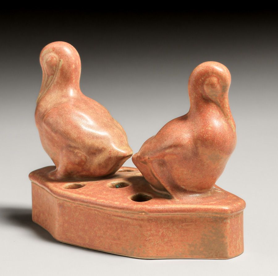 California Porcelain Monochromatic Ducks Flower Frog c1927-1929. Signed. Perfect condition. 7.25″w x 5.5″h x 3 5/8″ SOLD