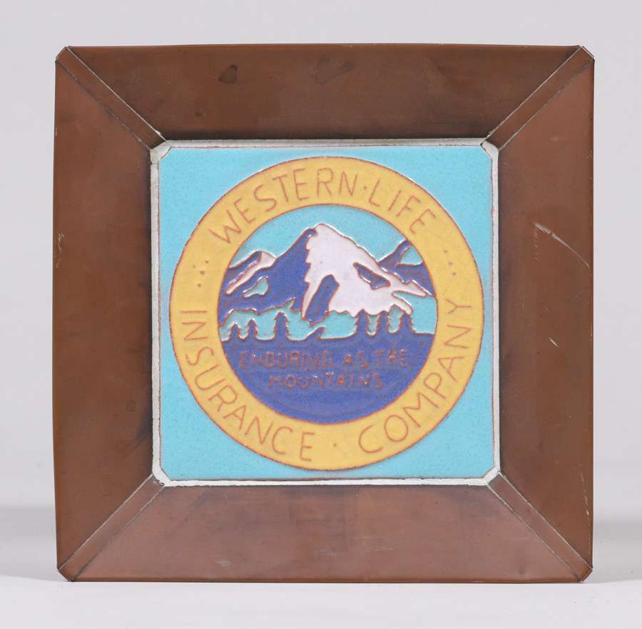 Arts & Crafts ceramic tile similar to California Faience in glaze and execution. Made by the Gila Bend Pottery Co of Arizona c1920s-1930s for The Western Life Insurance Company. Kirby Brown speculates that there may have been a connection between these two potteries and that the tiles may have even been made at California Faience. Perfect condition. Tile 6.25"sq. Copper frame 9.75"sq $450
