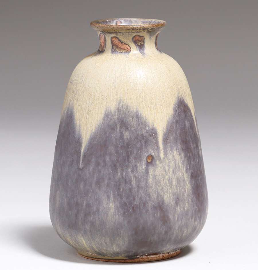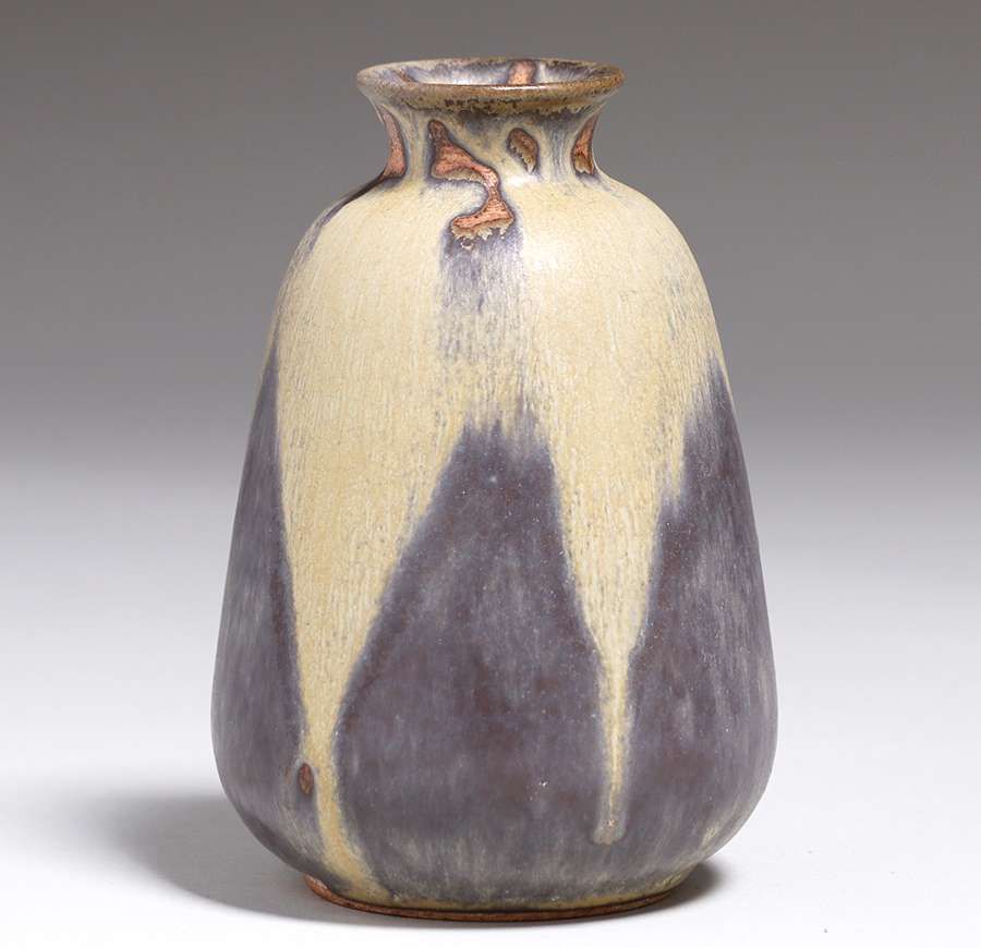 Chauncey R. Thomas vase with mustard drip glaze dated 1906, Alfred, NY. Thomas made this under the direction of Charles Binns and shows the influence of Binns upon the later glazes of California Faience and California Porcelain. Thomas started California Faience (The Tile Shop) in Berkeley in 1913. Invisible professional restoration to small rim chip, otherwise perfect condition. Incised "CRT '06". 6"h x 4"d SOLD