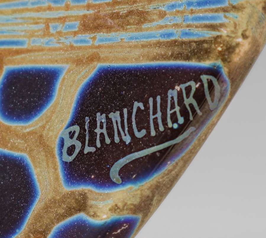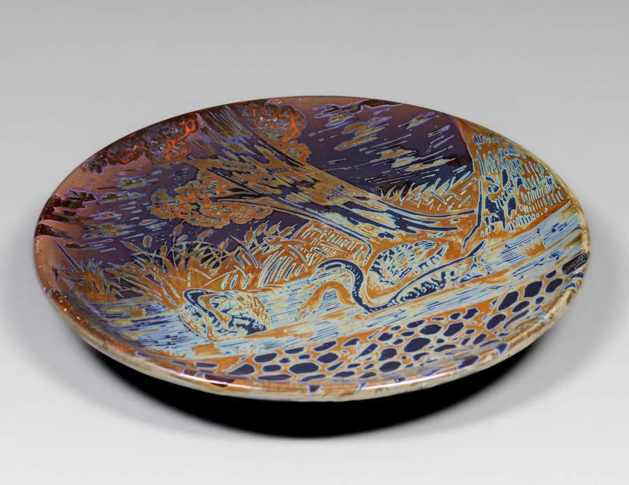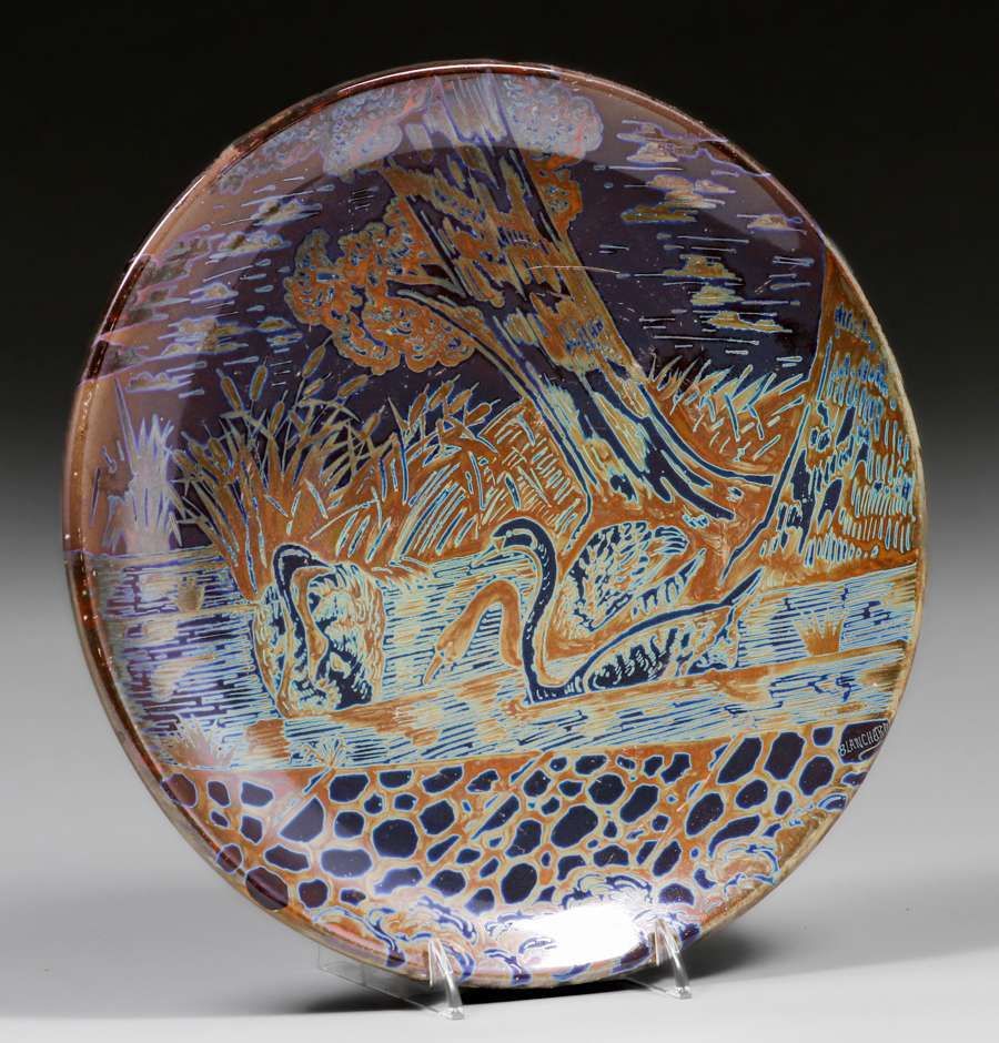 Jerome Massier (1850-1916) Iridescent Swans Charger c1894. Brother of Clement Massier. Artist signed "Blanchard". Invisible professional restoration to a few light surface scuffs otherwise perfect condition. 9.75"d SOLD