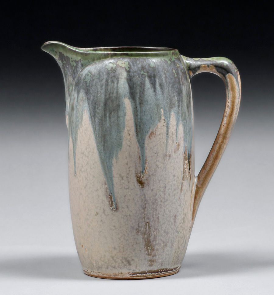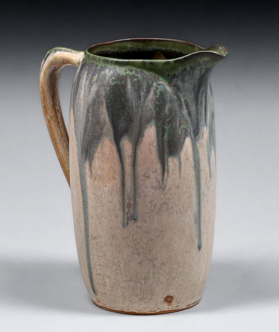 - Denbac Pottery - French Microcrystalline Green & Grey Drip Pitcher c1910s