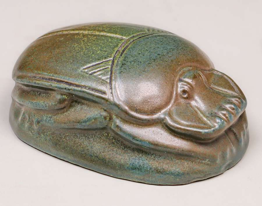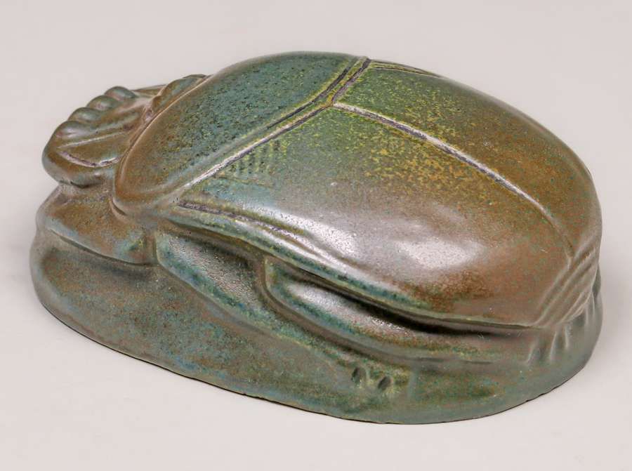 Denver Terra Cotta Co Matte Green Scarab Paperweight c1910. Signed. Invisible professional restoration to two small edge chips, otherwise perfect condition. 3.75" x 2.75"w x 1.5"h SOLD