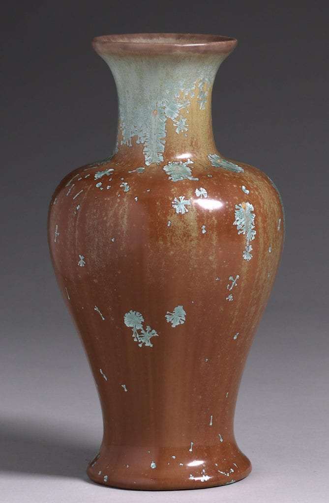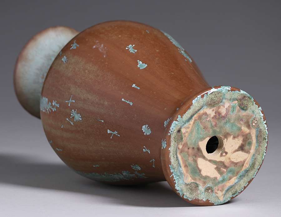 Carl Bergman crystalline vase made for either American Encaustic Tile Co (1916-1919 or Flint Faience Tiling Co (1921-1925). Bergman worked for both and took his glaze with him. Pictured in California Faience page 162. Unsigned. Drilled for a lamp base, otherwise perfect condition. 12.5"h x 6.25"d SOLD