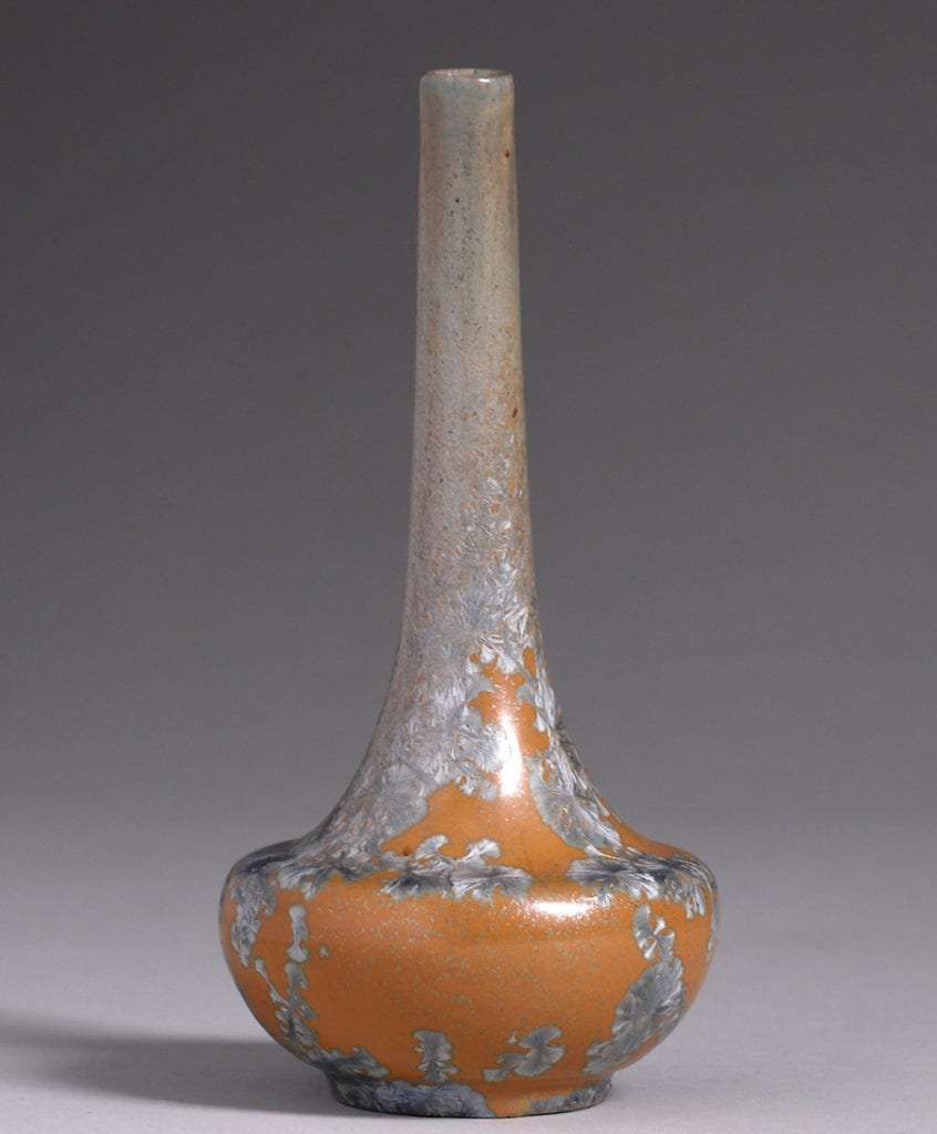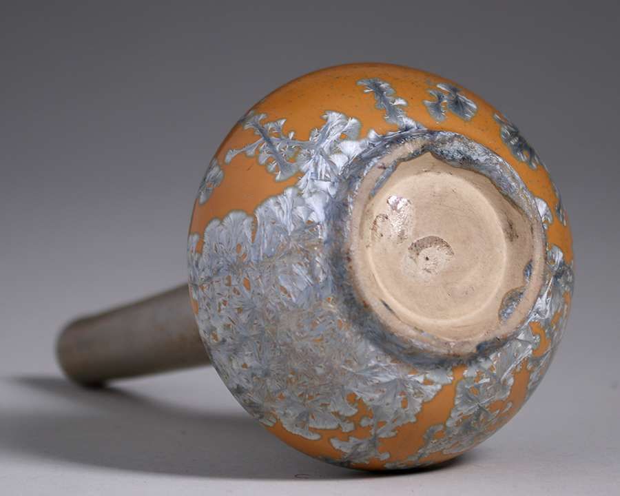 Flint Faience Tiling Co crystalline stem vase c1921-1925. Unsigned. Similar piece pictured in Flint Faience Tiles A to Z on page 95. Slight lean to stem, otherwise perfect condition. 8.5"h x 3.75"d SOLD