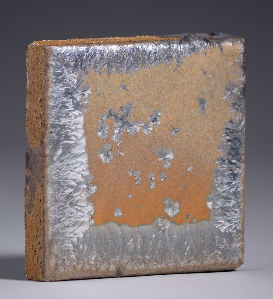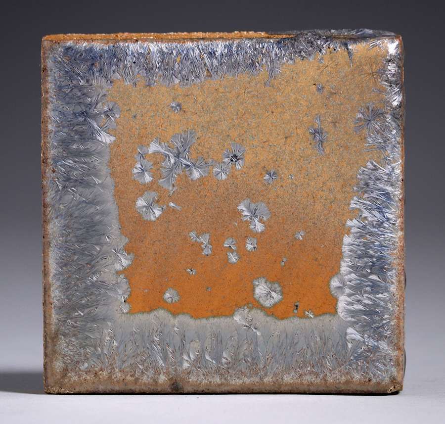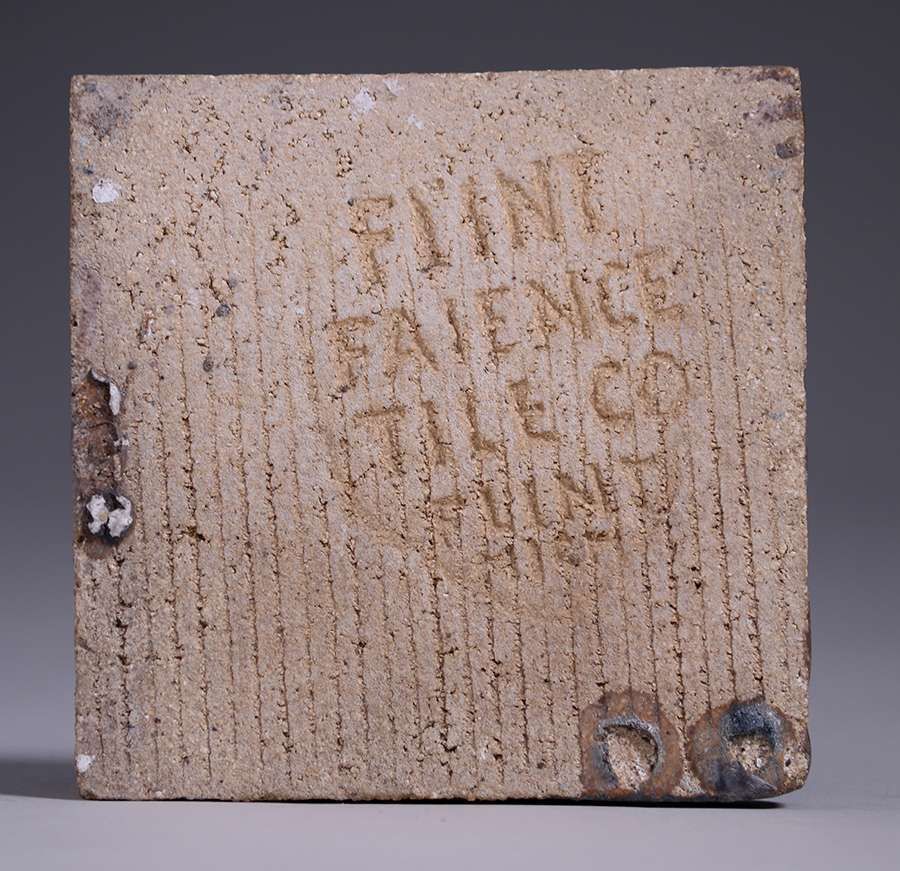 Flint Faience square crystalline tile c1921-1925. Flint Faience was a division of AC Spark Plug Division of General Motors. Because the kiln that made spark plugs only operated 6 months of the year, they added a Tile Company in 1921 to keep their kiln busy year round. Carl Bergmans is credited with bringing the crystalline glaze to Flint Faience from AETCO. Signed. Two small corner chips, otherwise perfect condition. 4.25" x 4.25" SOLD