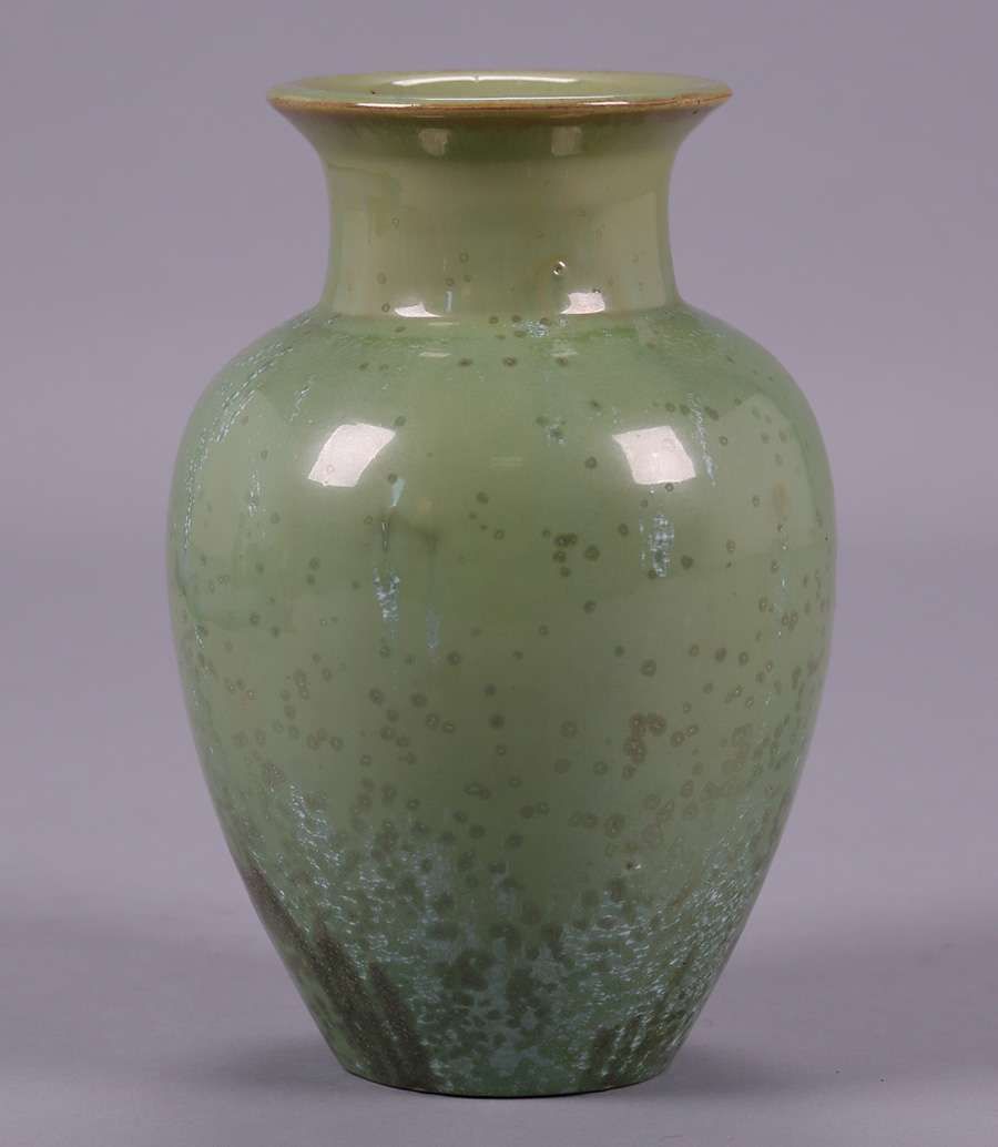 Fulper Pottery vase with flared rim. Light green leopardskin glaze. Signed with early Vasecraft paper label. Perfect condition. 11.5"h x 7.5"d. SOLD