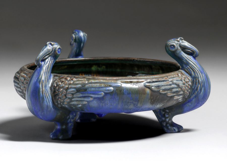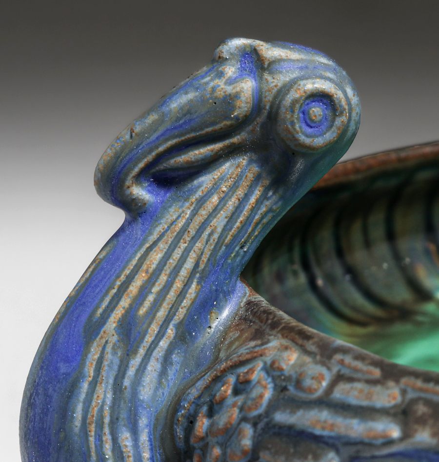Early Fulper Pottery - Vasekraft Ibis Bowl c1910. Signed. Invisible professional restoration to lines in neck and small edge chips to feet. Excellent definition. 11d x 5.25h inches SOLD