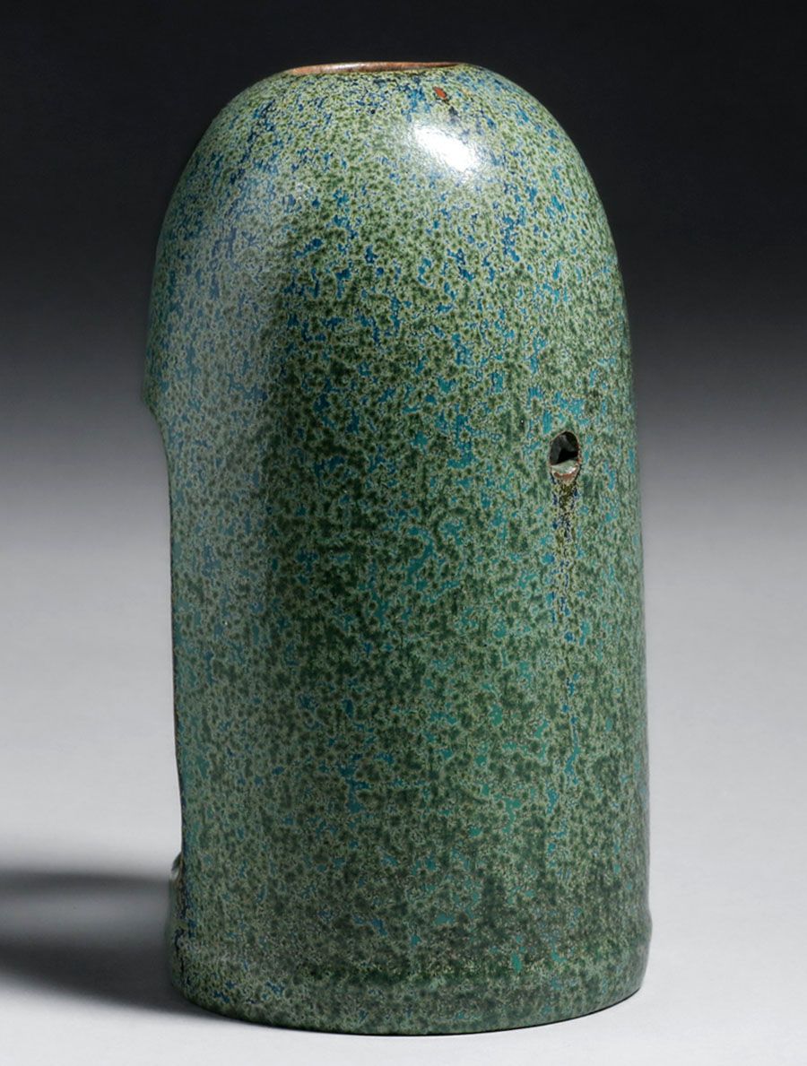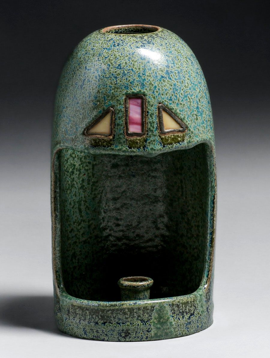 Fulper Pottery #1000 Leaded Glass Candle Sconce c1910. One of the best examples of Fulper glaze we have seen on this form. Signed with original paper label. Small flat base chip, otherwise perfect condition. 10.5″h x 6″d SOLD