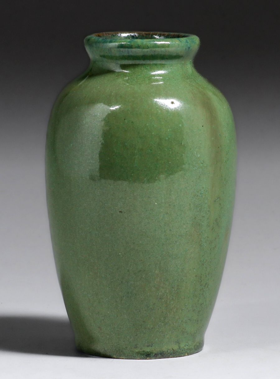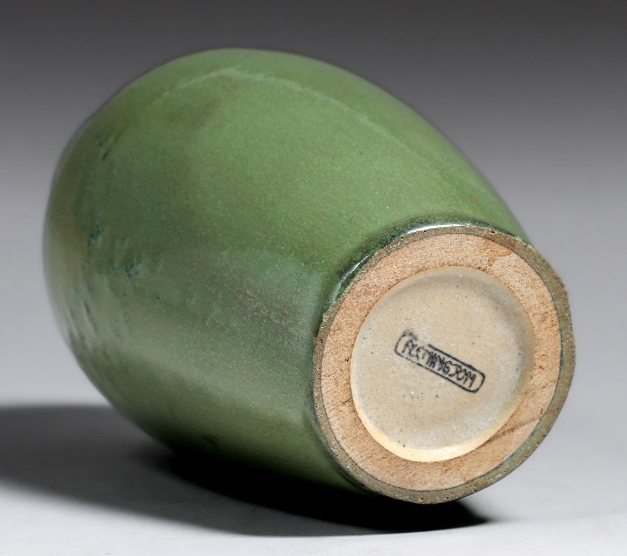 Fulper Pottery Flemington Chinese Green Vase c1910. Signed with rare Flemington mark. Tiny grinding chips on base, otherwise perfect condition. 5 7/8h x 3.25d inches SOLD