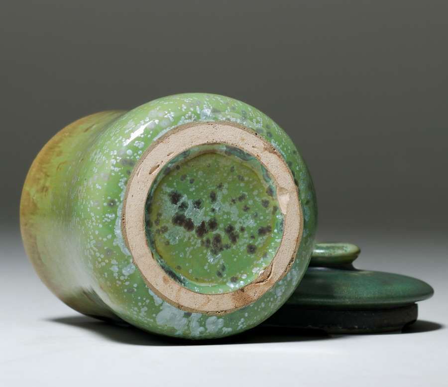 Fulper Pottery Leopardskin Humidor c1910. Glazed over signature. Original lid glaze fired darker than base but original. A couple of glaze bubbles and grinding stilt pull, otherwise perfect condition. 7.75"h x 5.5"d SOLD