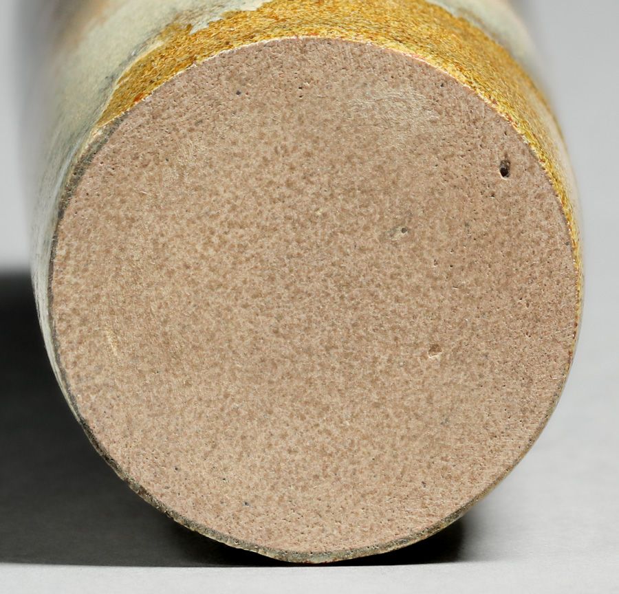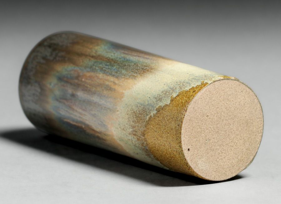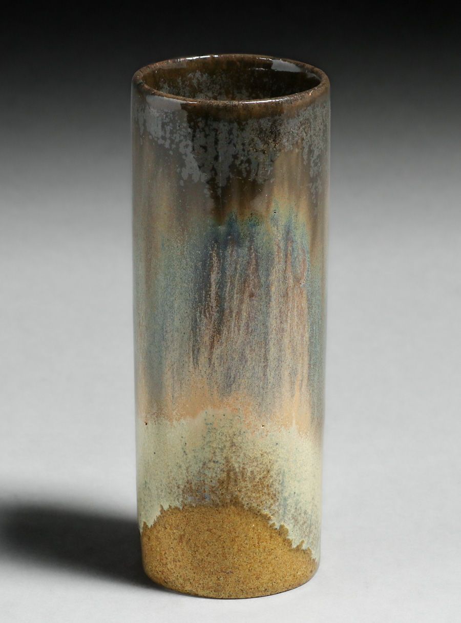 - Fulper Pottery Mirror Black Flambé over Matte Mustard Cylinder Vase c1910