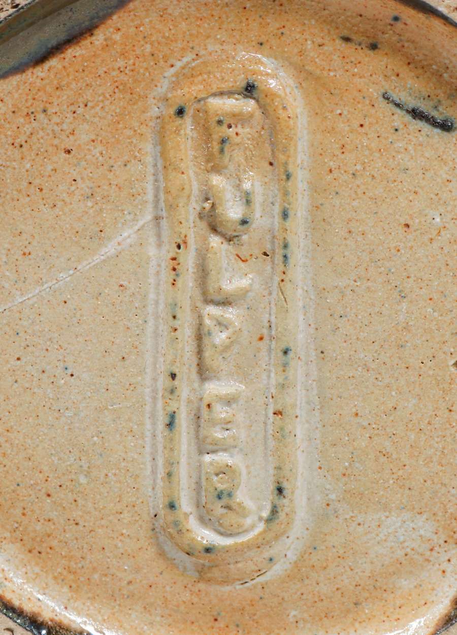 Fulper Pottery Olive Blue Flambe Flared Vase c1910s. Signed. Invisible professional restoration to small base chips, otherwise perfect condition. 6 7/8"h x 5.25"d SOLD