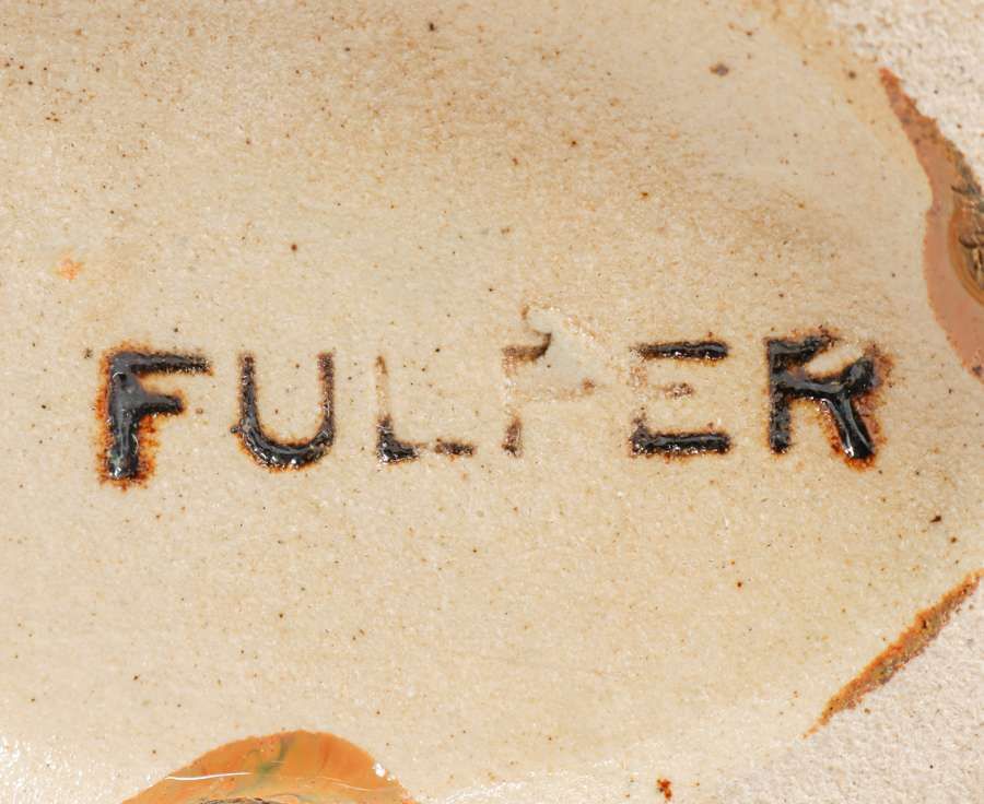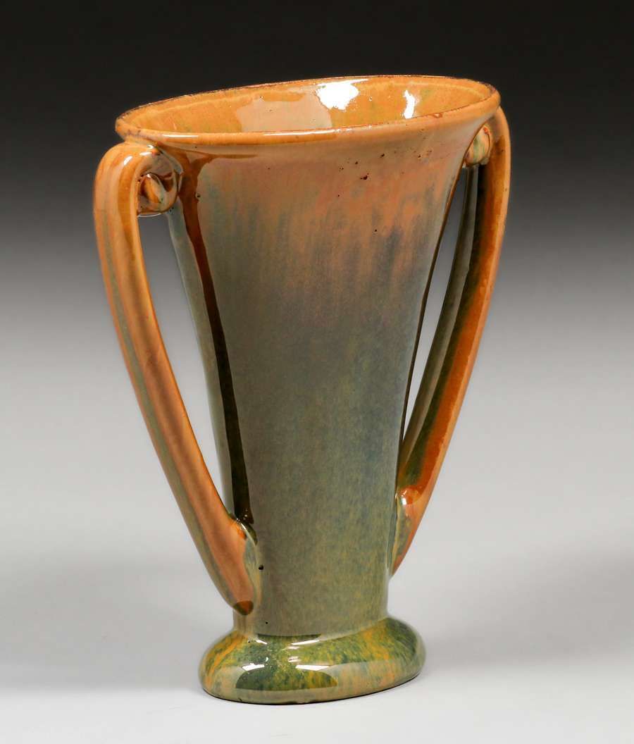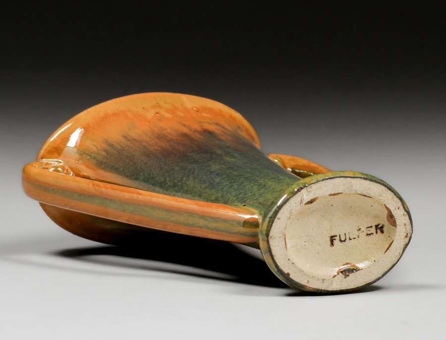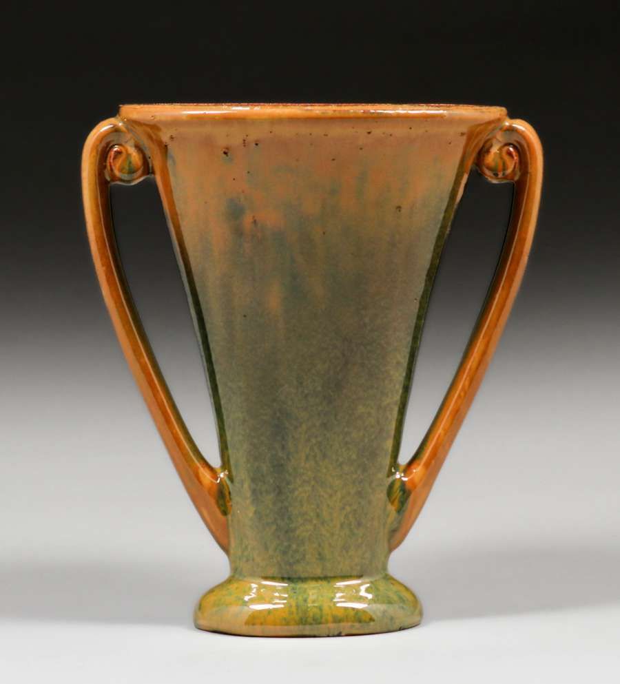 - Fulper Pottery Orange & Dark Green Flambe Two-Handled Pillow Vase c1920
