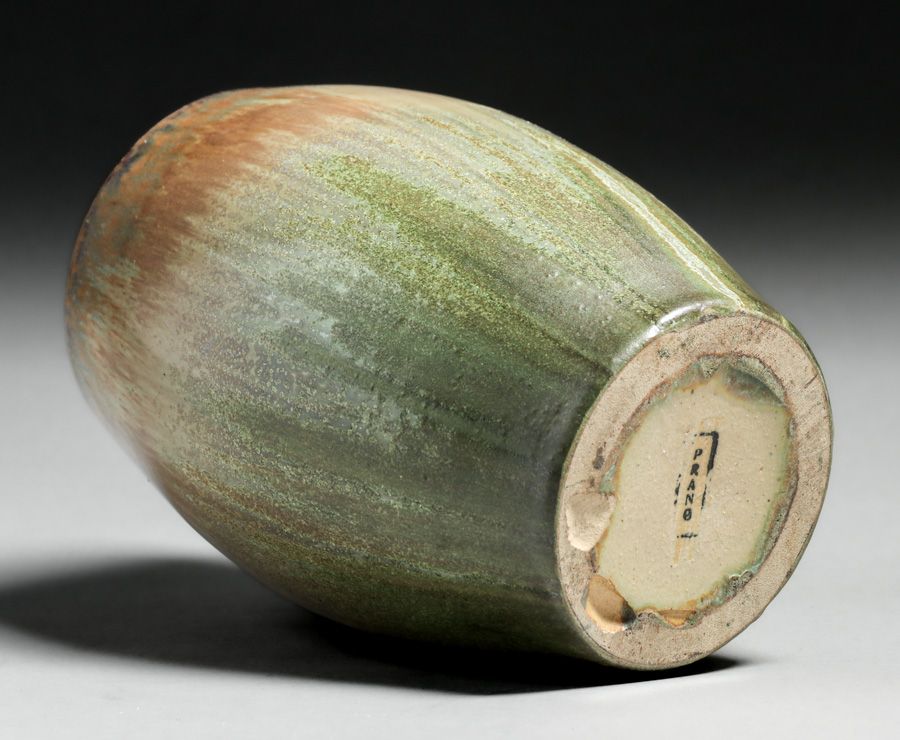 Fulper Pottery – Prang Cucumber Flambe Vase c1910. Prang was a department store that sold Fulper Pottery. Signed. A couple of interior grinding chips to base, otherwise perfect condition. 7.75″h x 5"d SOLD