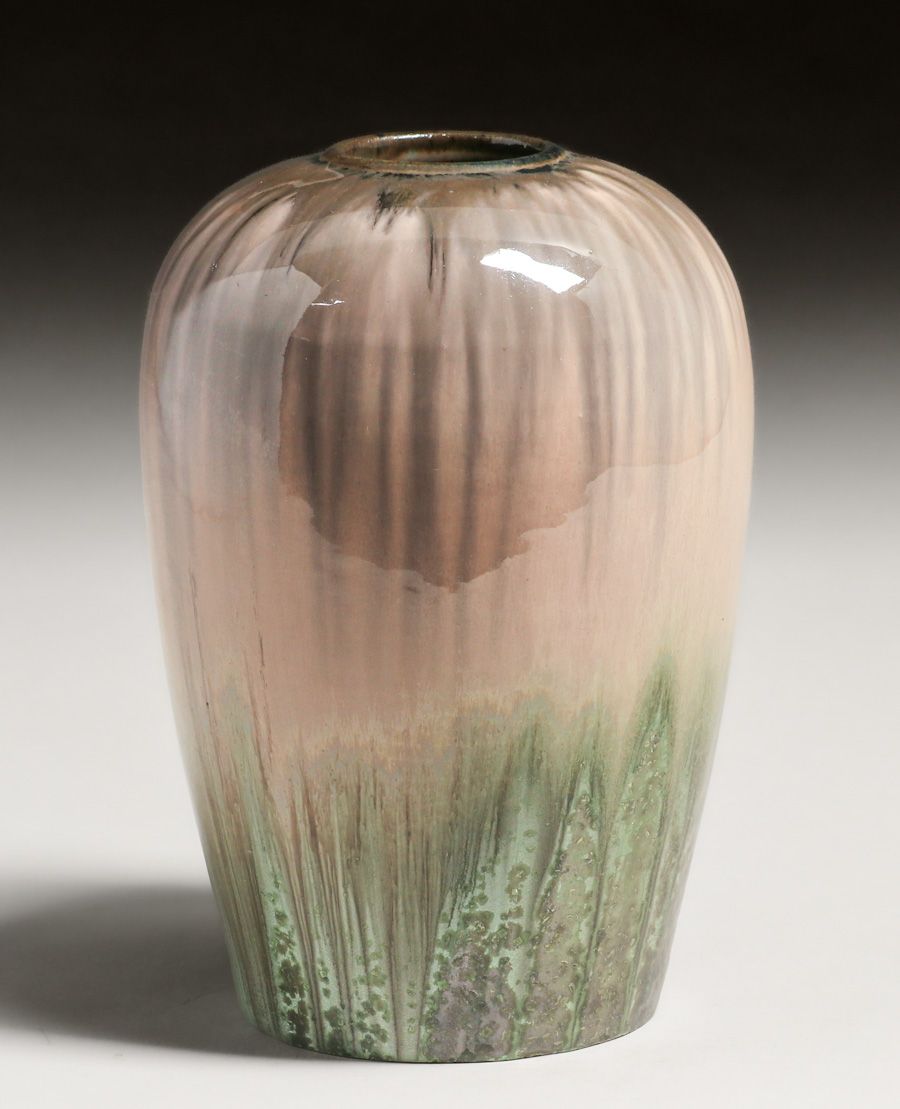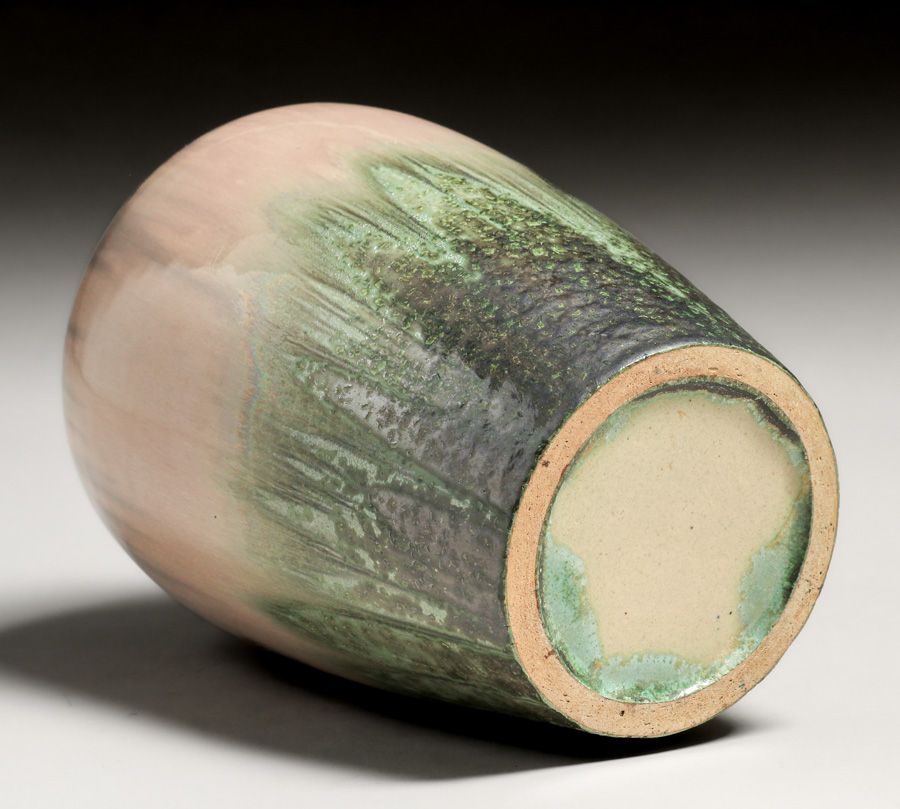 Fulper Pottery Round-Top Vase c1910. Exquisite Elephant’s Breath – Leopardskin Glaze. Unsigned. Invisible professional restoration to a couple of tiny grinding flecks, otherwise perfect condition. 8 3/8″h x 5.5″d SOLD