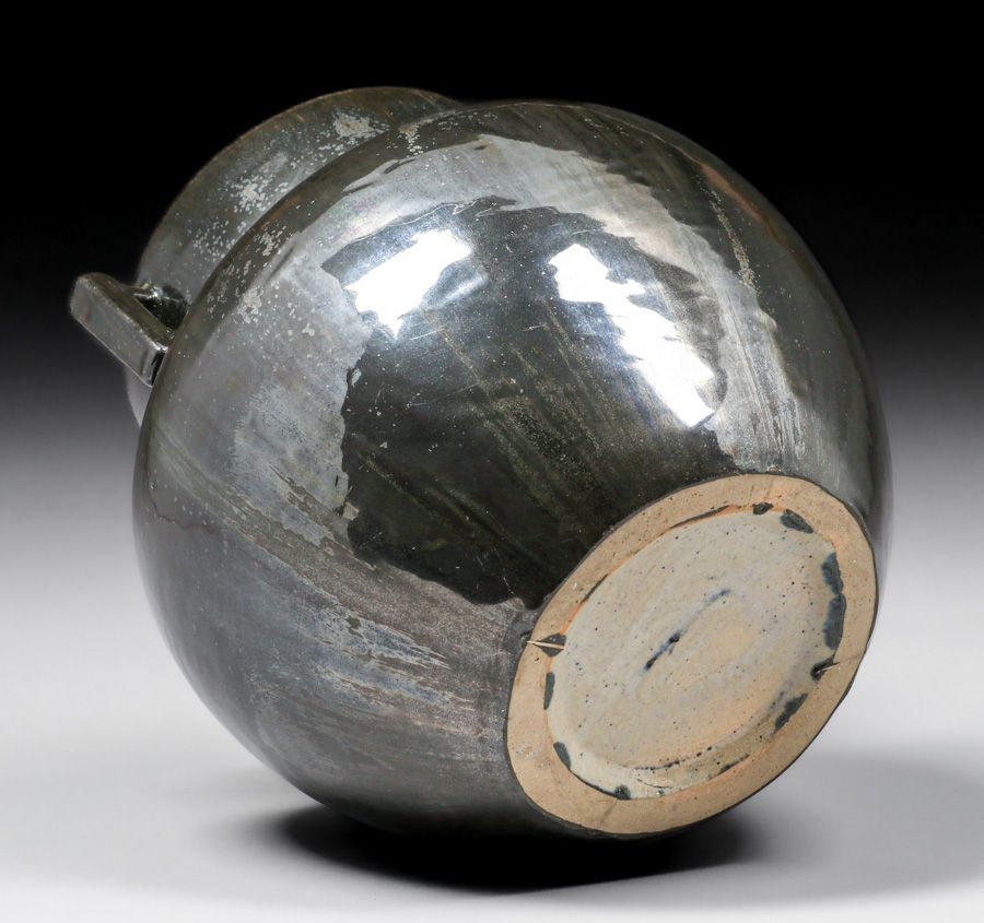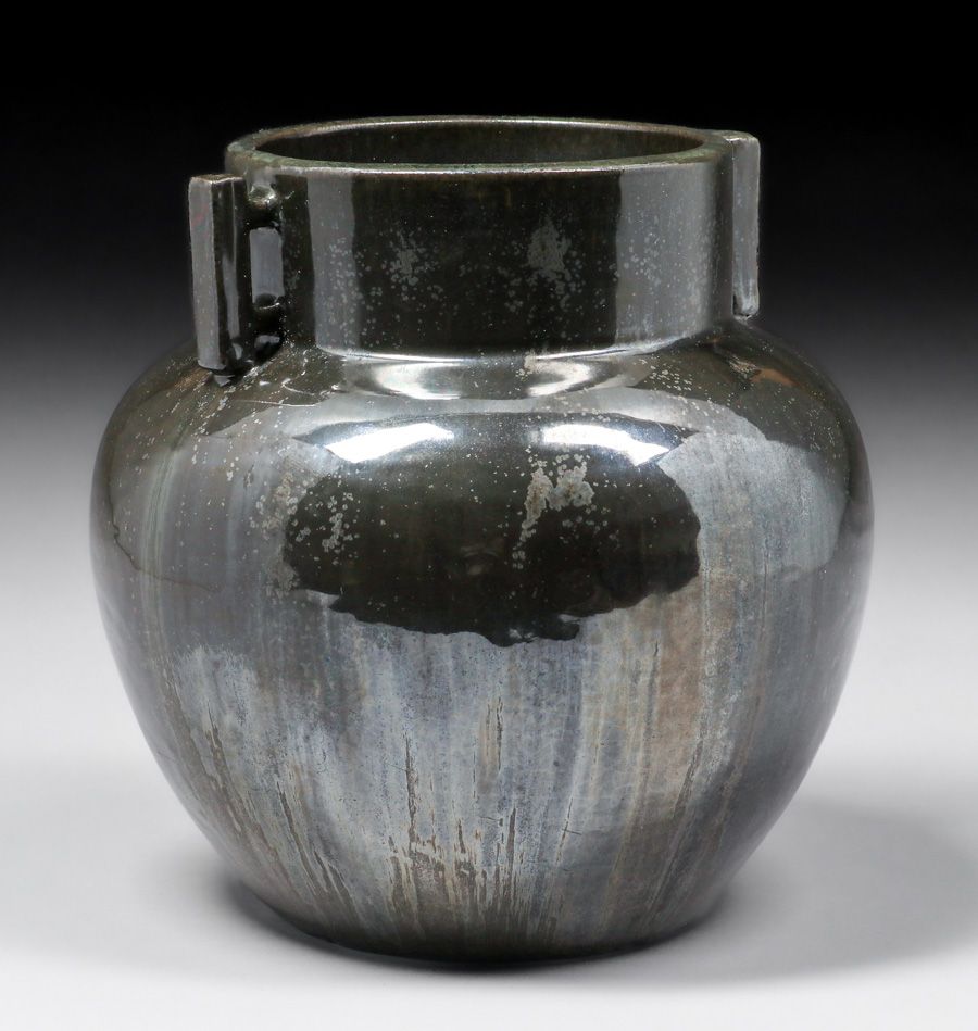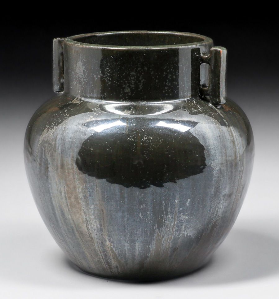 Fulper Pottery Speckled Mirror Black Two-Handled Chinese Form Vase c1910s. Signed. Invisible professional restoration to tight hairline, otherwise perfect condition. 9.25"h x 9"d $950