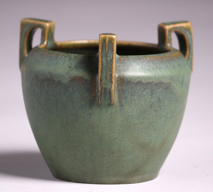 Fulper Pottery three-handled matte green vase. Signed. Slight separation in one handle during production, otherwise perfect condition. 4.25"h x 4.5"d SOLD