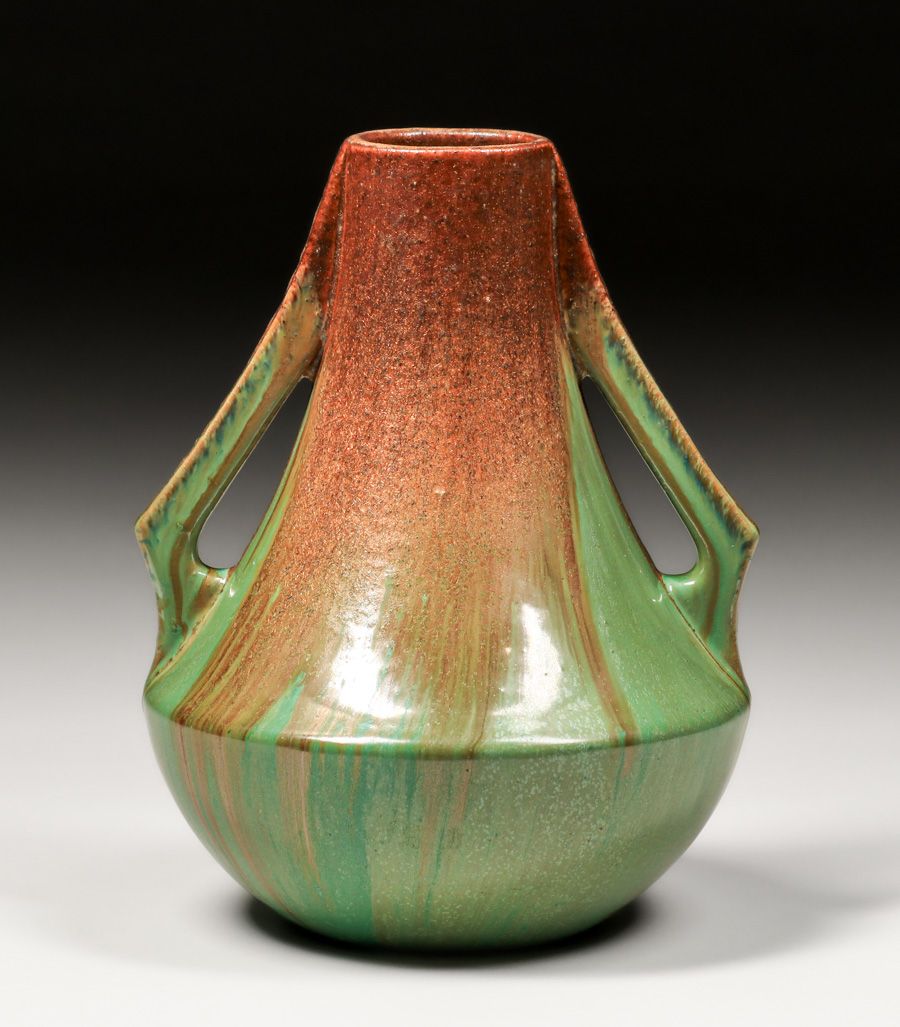 - Fulper Pottery Two-Handle Copperdust Green Flambe Vase c1910s