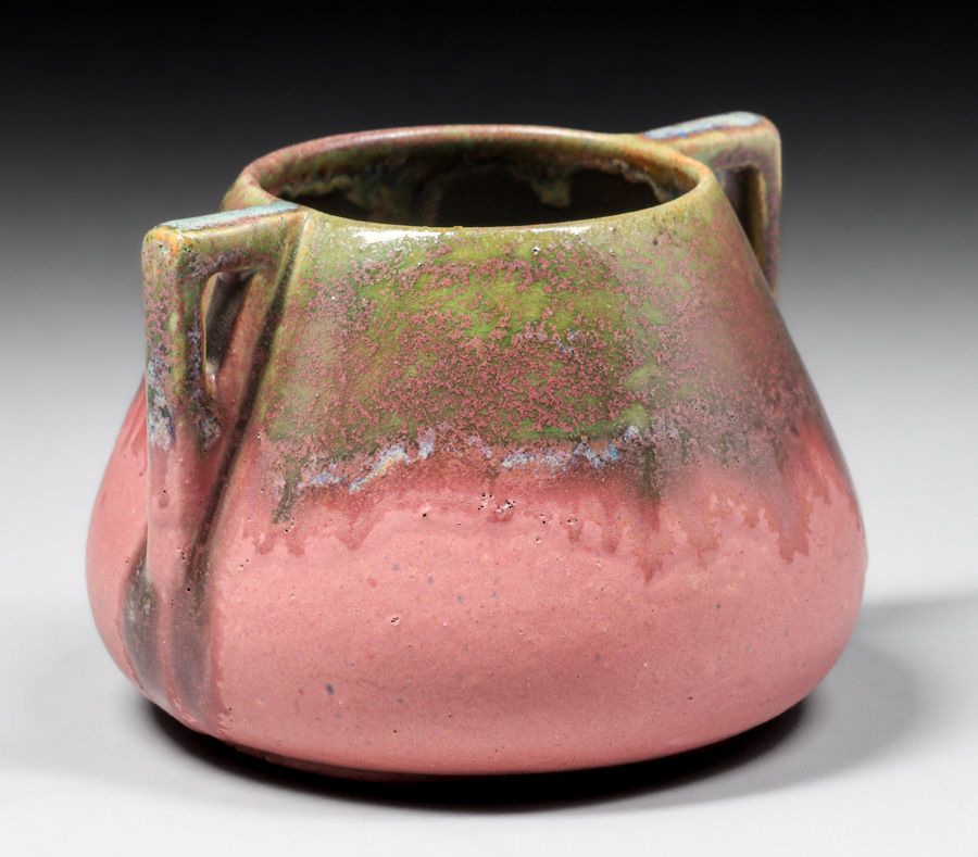 Fulper Pottery Two-Handled Celadon Green over Matte Pink Vase c1910s. Signed. A couple of tiny grinding flecks, otherwise perfect condition. 6"w x 4.25"h SOLD