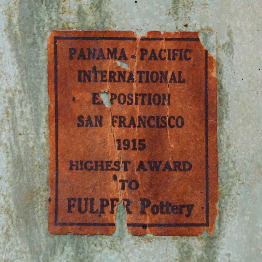 Fulper Pottery Two-Handled Green Vase 1915. Rare Panama Pacific International Exposition Label on front. Restoration to handle otherwise perfect condition. 11" h x 5"d SOLD