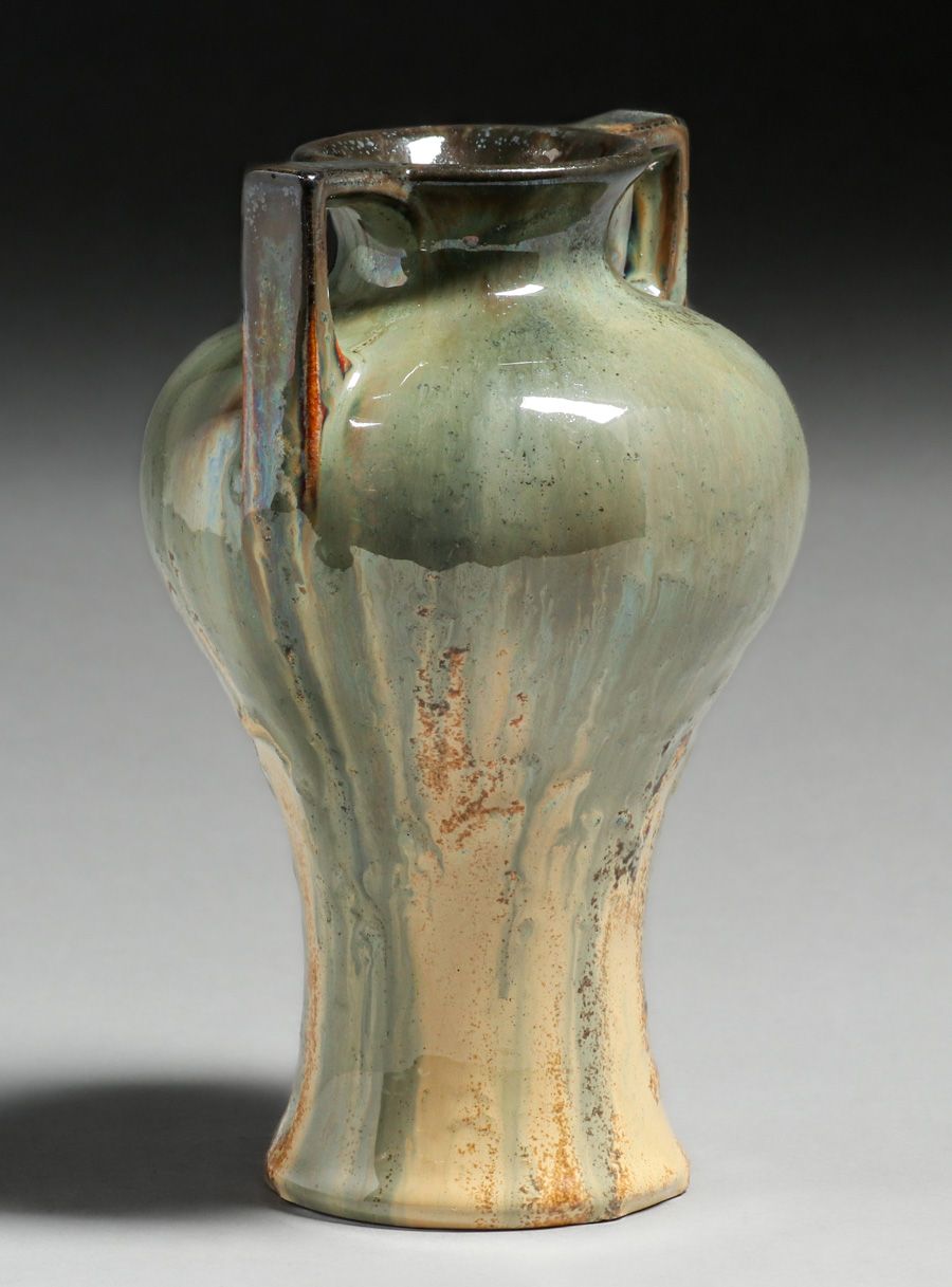 - Fulper Pottery Two-Handled Mirror Black Butterscotch Flambe Vase c1910