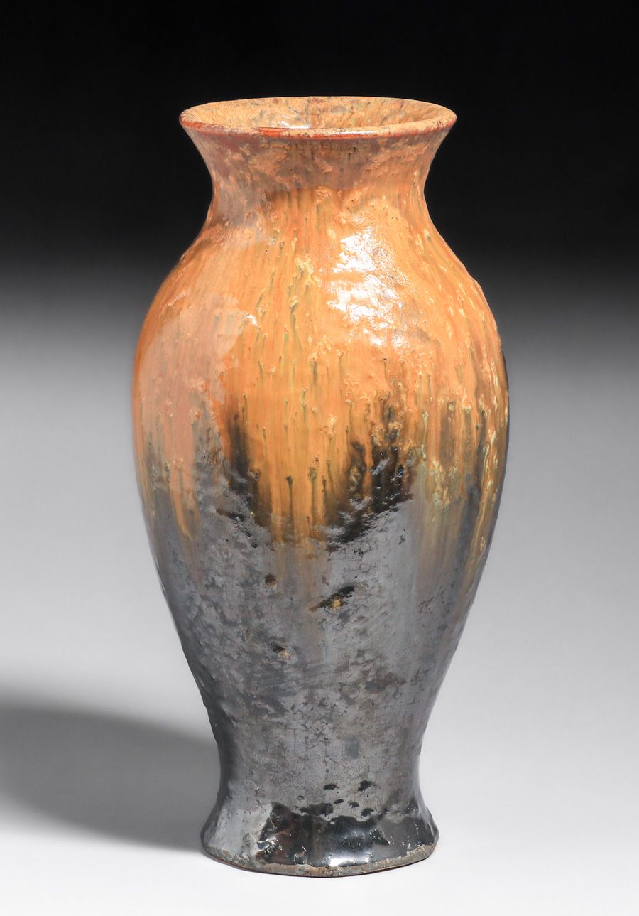 - Large Fulper Pottery Orange & Mirror Black Flambe Vase c1910