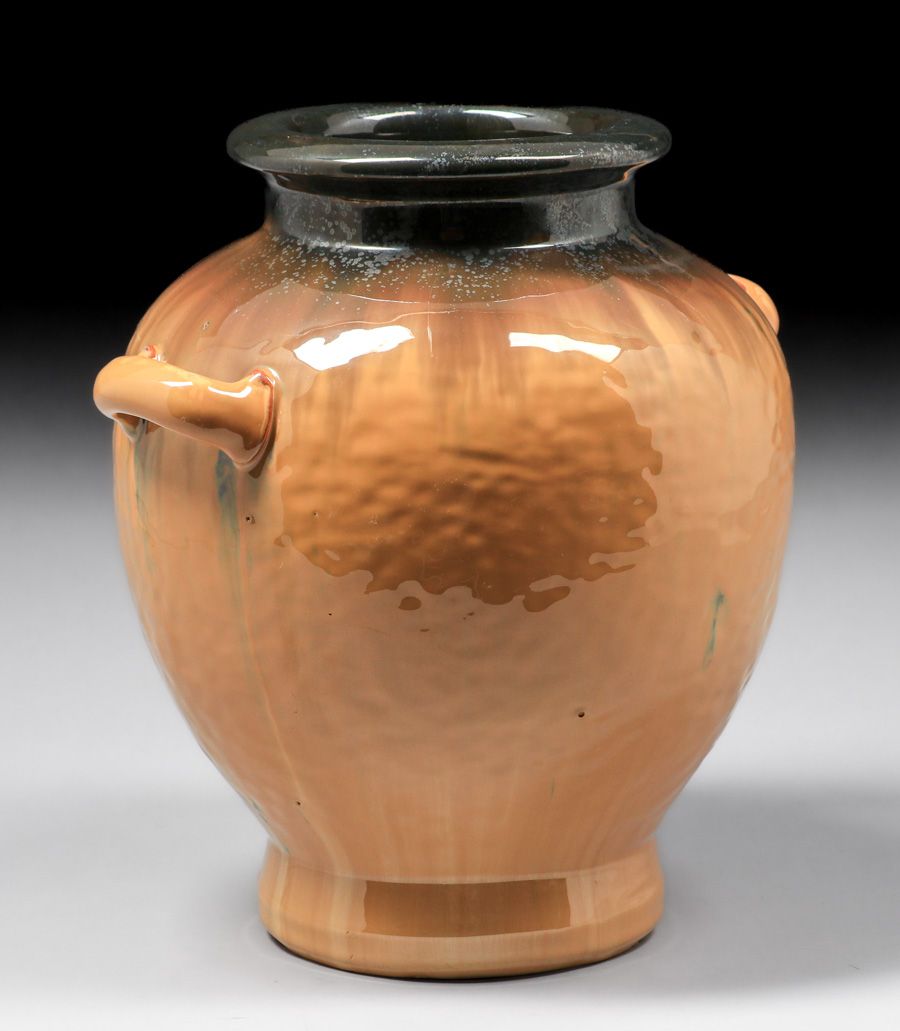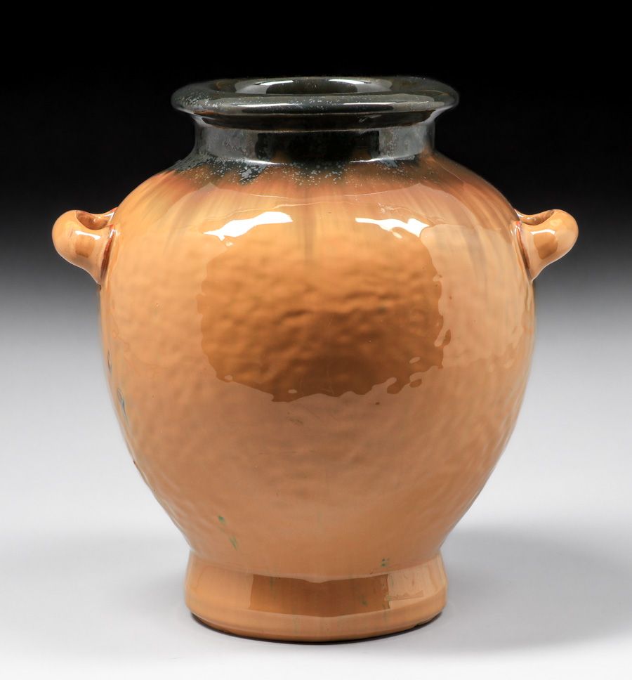 - Large Fulper Pottery Orange & Mirror Black Two-Handled Bulbous Vase c1910s