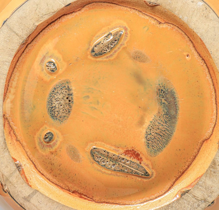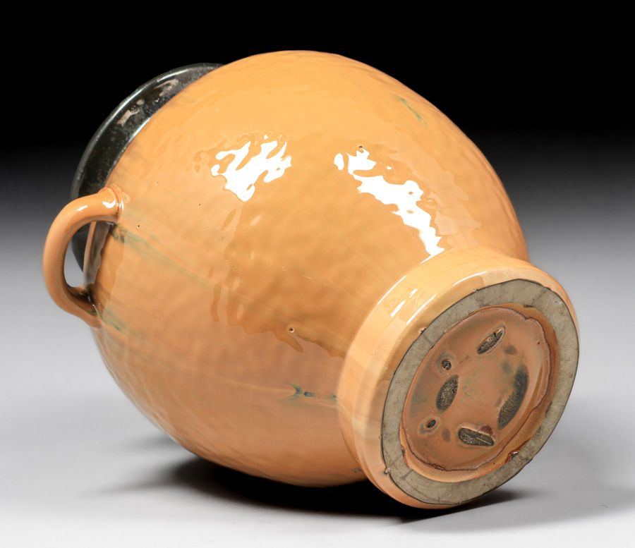 Large Fulper Pottery Orange & Mirror Black Two-Handled Bulbous Vase c1910s. Signed. Perfect condition. 12″h x 11″w x 9″d SOLD