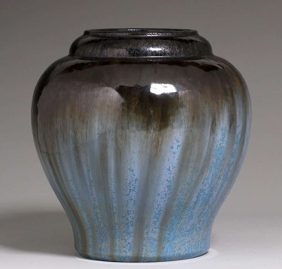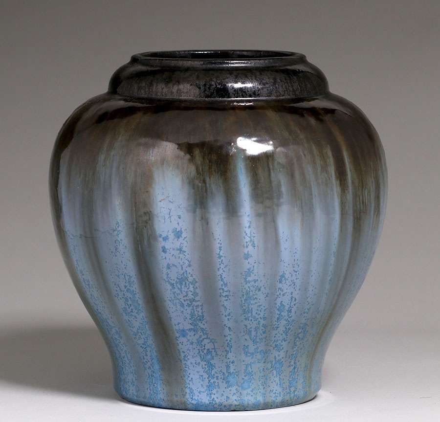 Massive Fulper Pottery bulbous vase with mirror black and blue crystalline flambe glaze c1910. In-body line in base, otherwise perfect condition. 12"h x 11"d SOLD